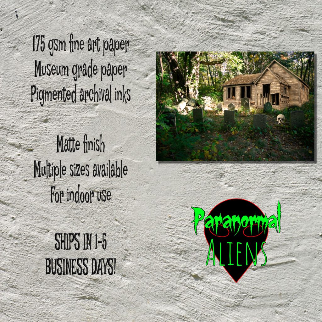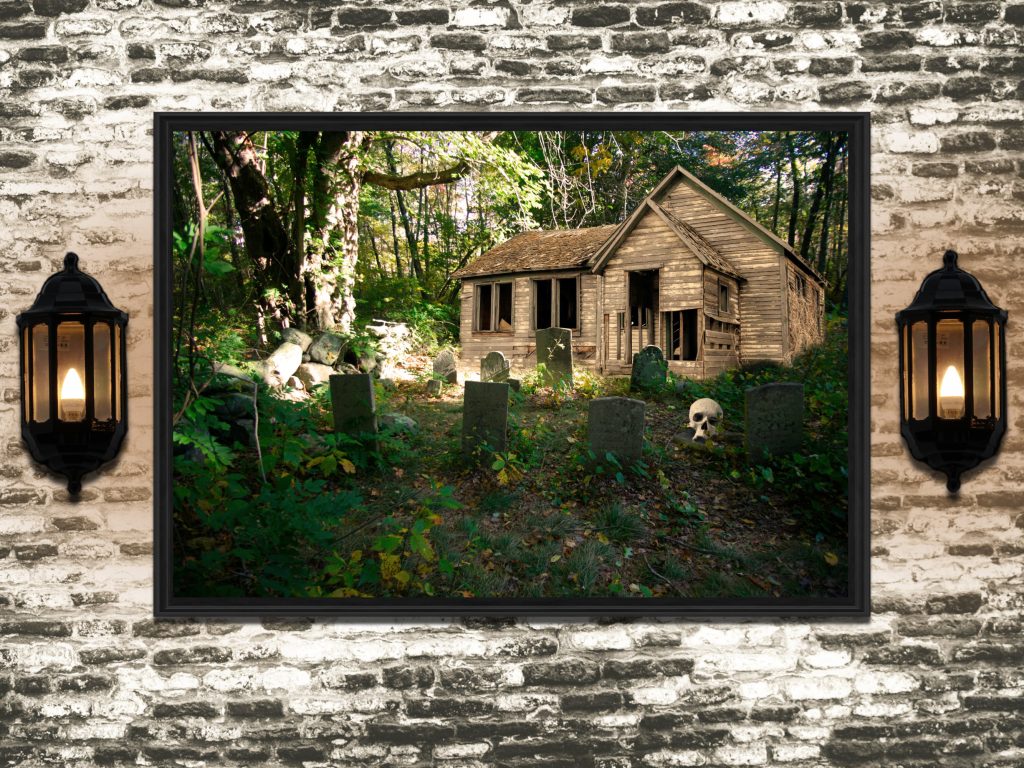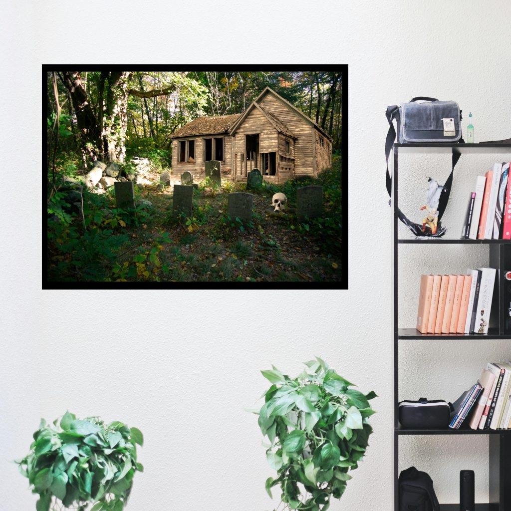 Spooky Cemetery Wall Art features an eerie abandoned shack looms behind a forgotten cemetery deep in the forest, creating a chilling atmosphere. Perfect for goth decor and horror lovers, this dark landscape poster Cemetery Wall Art makes an unforgettable horror gift or statement piece for your home.