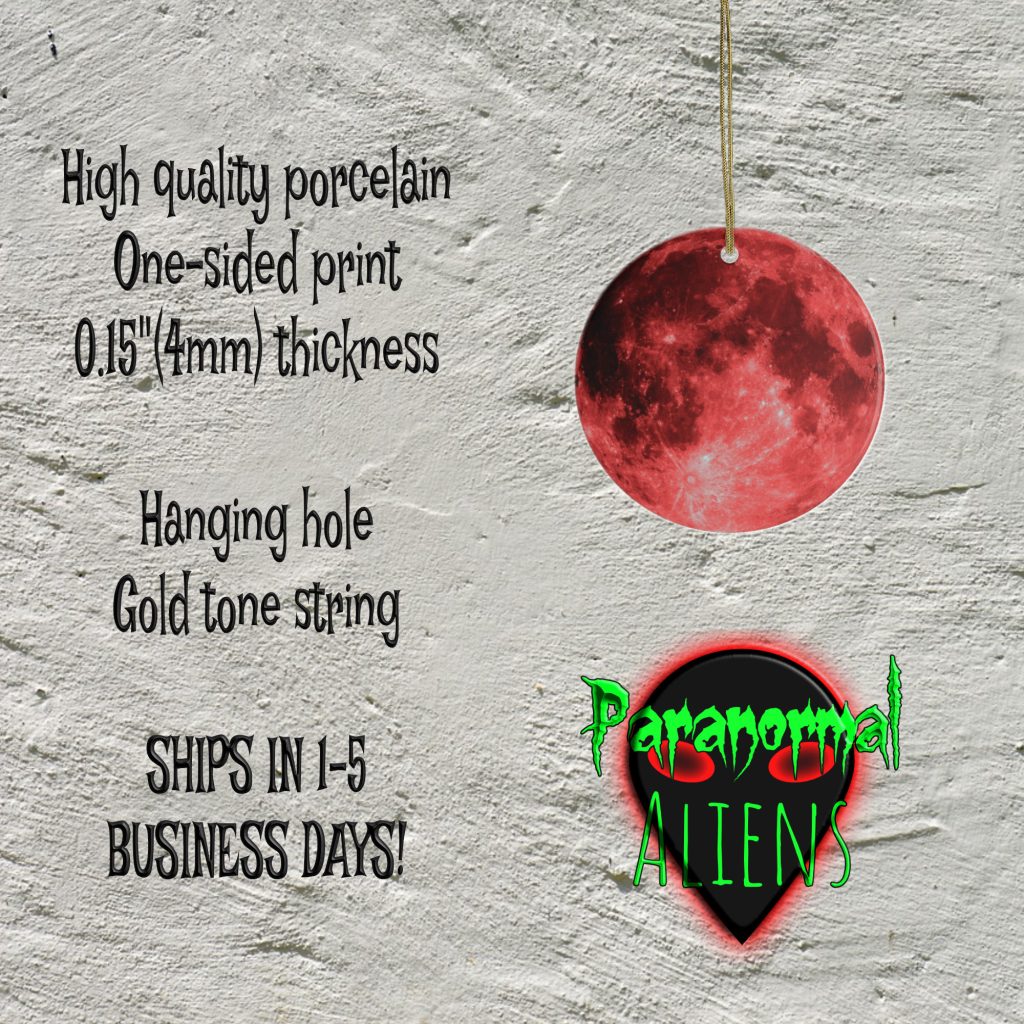 Introducing our captivating Blood Moon Christmas Ornament, a mesmerizing addition to your holiday decor, Halloween tree, or Gothic-inspired displays. Crafted from ceramic, this ornament showcases a striking blood moon design, evoking a sense of mystery and enchantment. Suspended by a gold-toned string, it effortlessly enhances any decor theme, whether you’re embracing the spooky spirit of Halloween or infusing your Christmas festivities with a touch of darkness. It also makes a perfect horror gift for her, appealing to those who appreciate the macabre and Gothic home decor. With its haunting allure, this red moon Christmas ornament seamlessly blends into your collection of creepy decor, adding a sense of intrigue and elegance. Elevate your holiday decorations with our Blood Moon Christmas Ornament, a captivating piece that brings the mystique of the night sky to your celebrations. Embrace the darkness and add a touch of Gothic elegance to your Halloween tree or adorn your Christmas tree with this hauntingly beautiful ornament. It’s the perfect Christmas gift for any lover of horror or Gothic home decor.