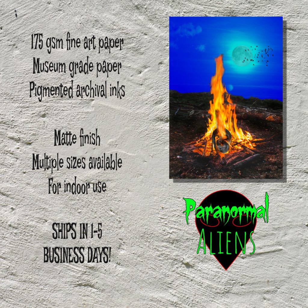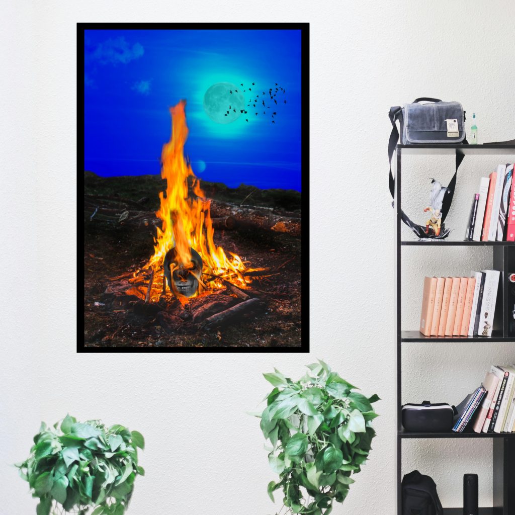 Embrace the macabre with our captivating Campfire Skeleton Art Print. This dark and haunting artwork showcases a flaming skull engulfed in the mesmerizing blaze of a campfire. As the moon peers through the clouds, its glow adds an eerie ambiance to the scene. The skull itself radiates a fiery orange glow, captivating the viewer’s attention and adding a touch of intensity to the composition. Perfect for lovers of macabre wall art and gothic aesthetics, this skeleton forest Horror Poster is an ideal gift for men who appreciate the darker side of art. With its intricate details and intense imagery, it’s also a unique and memorable gift for women seeking to add a touch of horror to their living space. Dive into the depths of darkness and ignite your imagination with this Skull Poster, Skeleton Art Print horror wall art, a truly captivating piece of dark art.