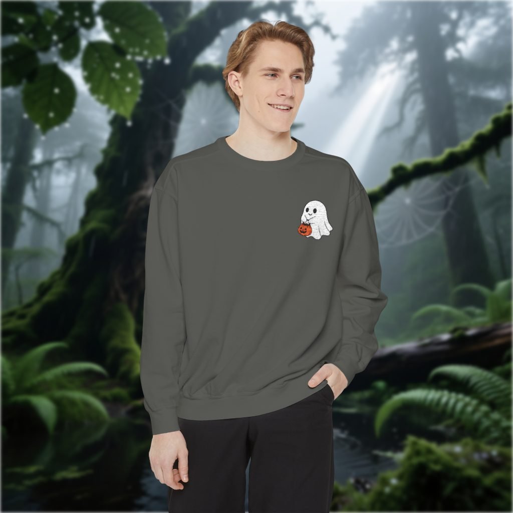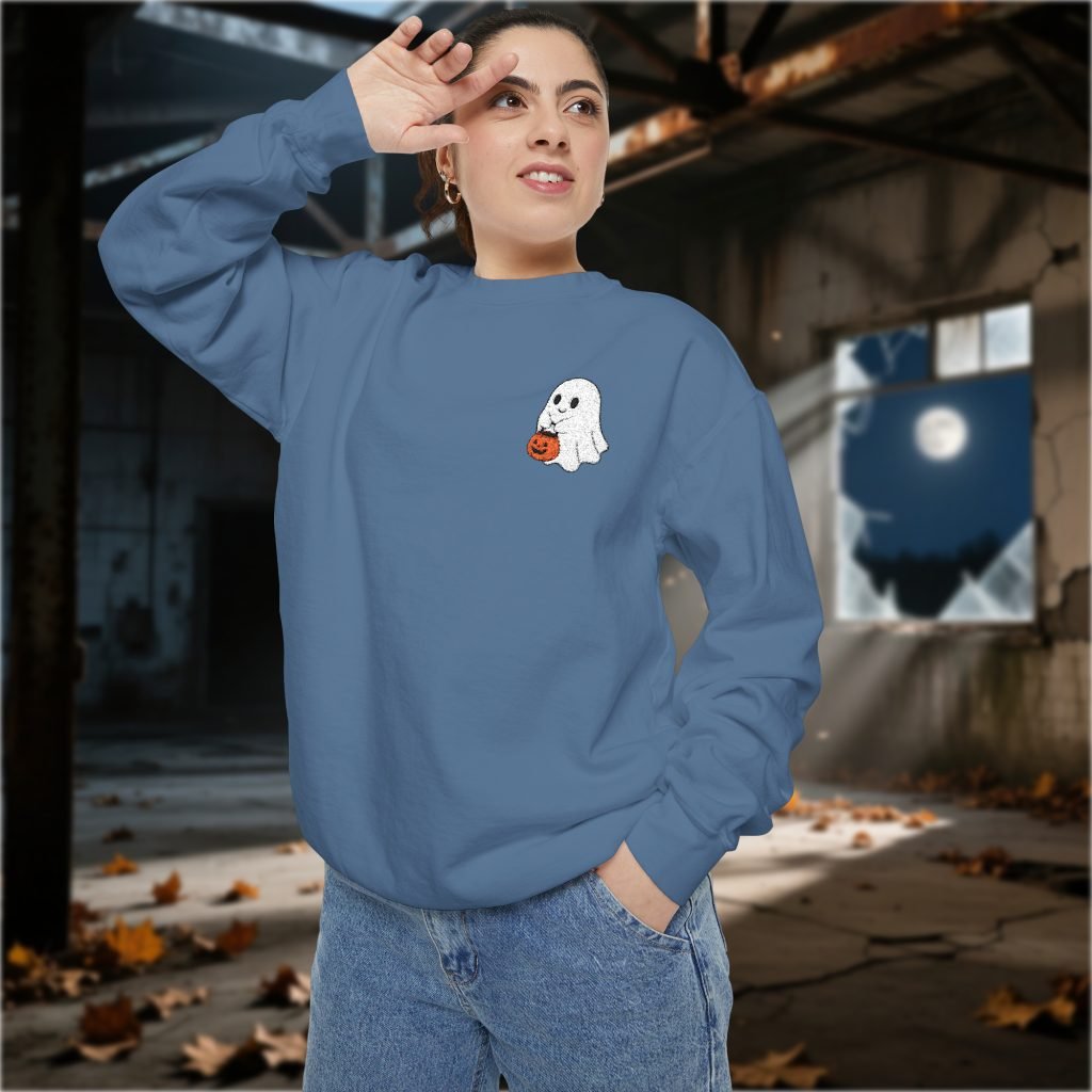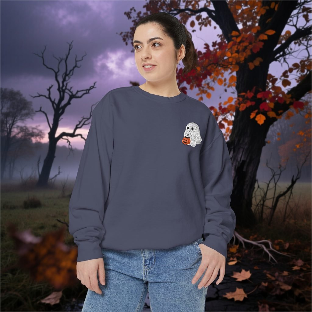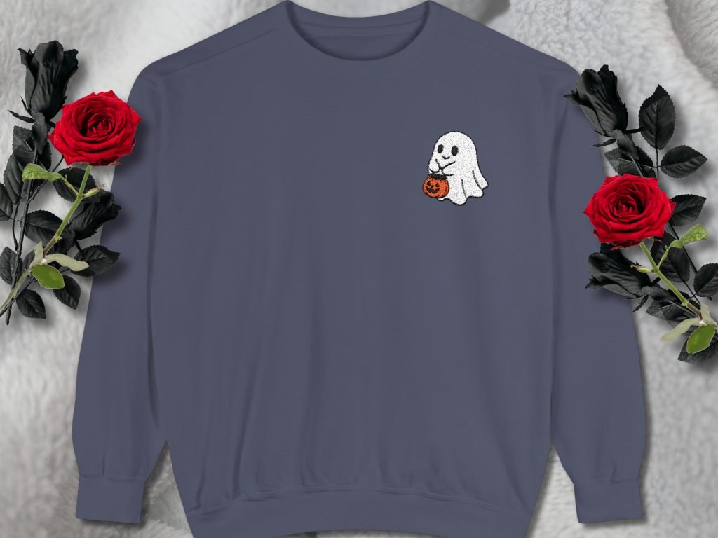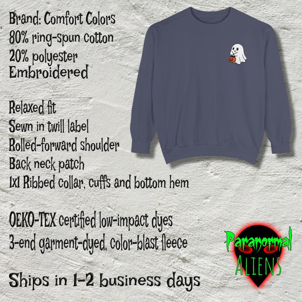 Celebrate spooky season with this Embroidered Halloween Sweatshirt with a cute ghost design in comfort colors brand. Soft cotton-poly blend, relaxed fit, and creepy-cute style for horror lovers and goth gifts.