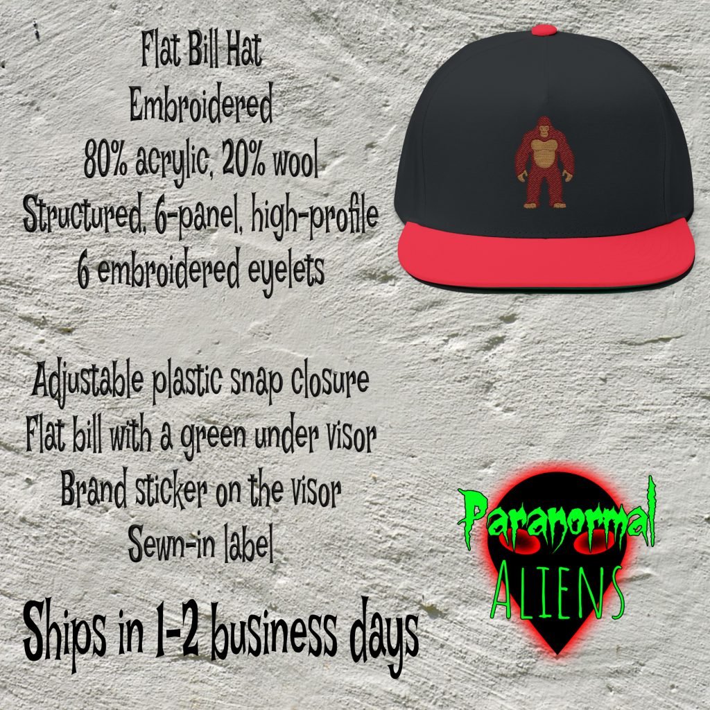 This embroidered Bigfoot hat is built for cryptid chasers and horror fans. Featuring a flat bill, sewn-in label, and adjustable fit, it’s a bold acrylic/wool cap that blends mystery with streetwear.