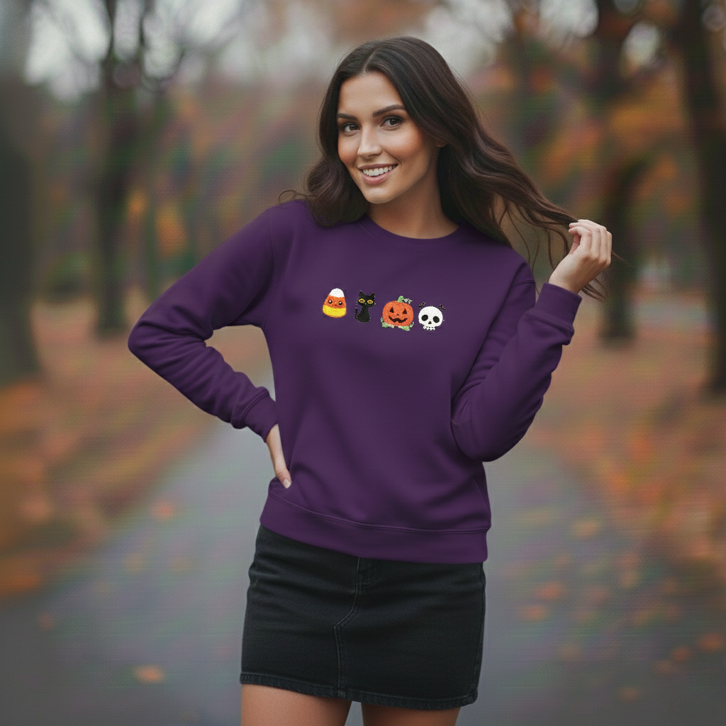 Celebrate spooky season in cozy style with this embroidered Halloween sweatshirt featuring pumpkins, skulls, and candy corn. Soft Gildan 18000 brand, relaxed fit.