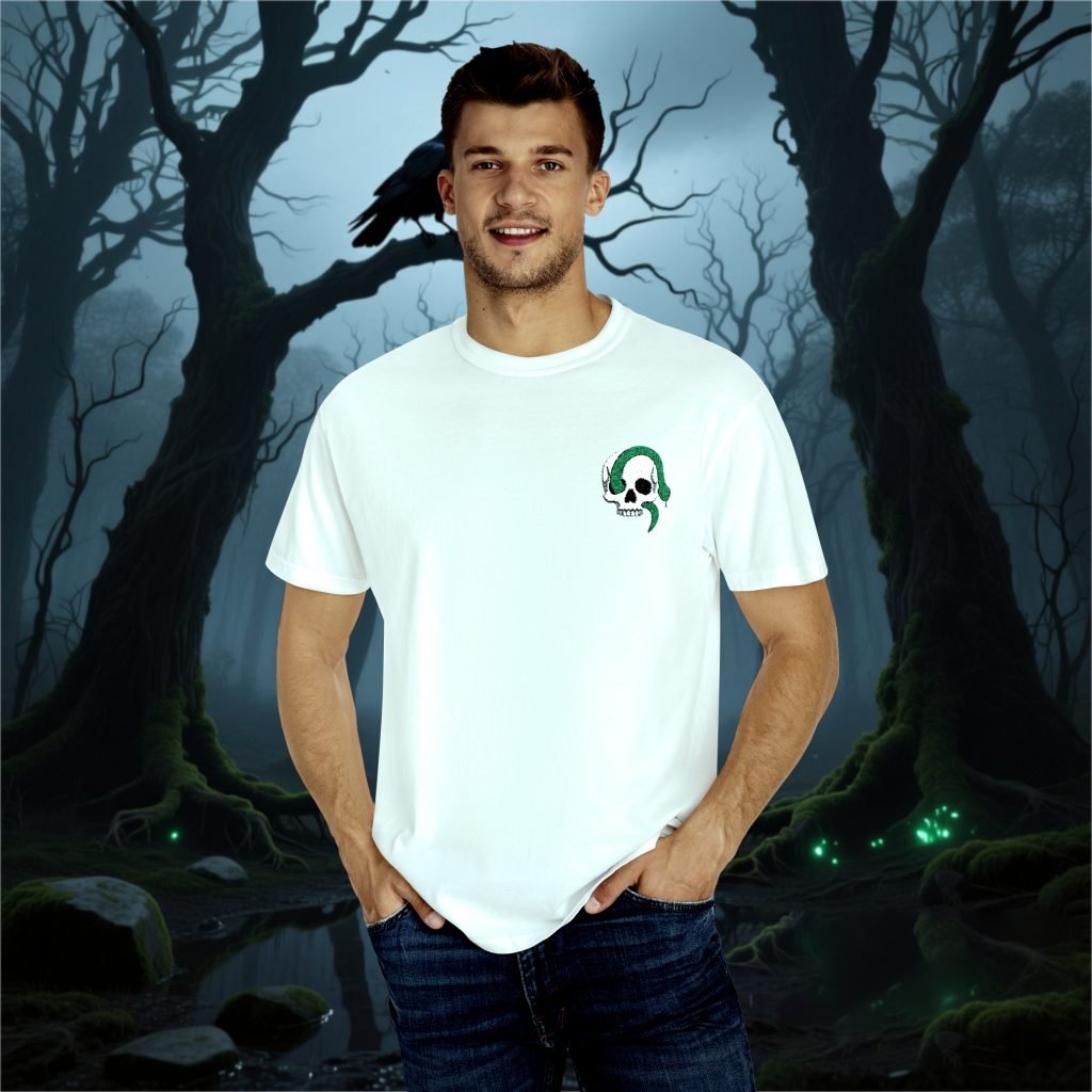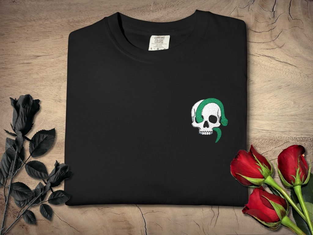 This Embroidered Skull Shirt features a stitched skull on comfort colors. Made with pre-shrunk ring-spun US cotton and a relaxed fit for horror lovers and spooky season gifting.