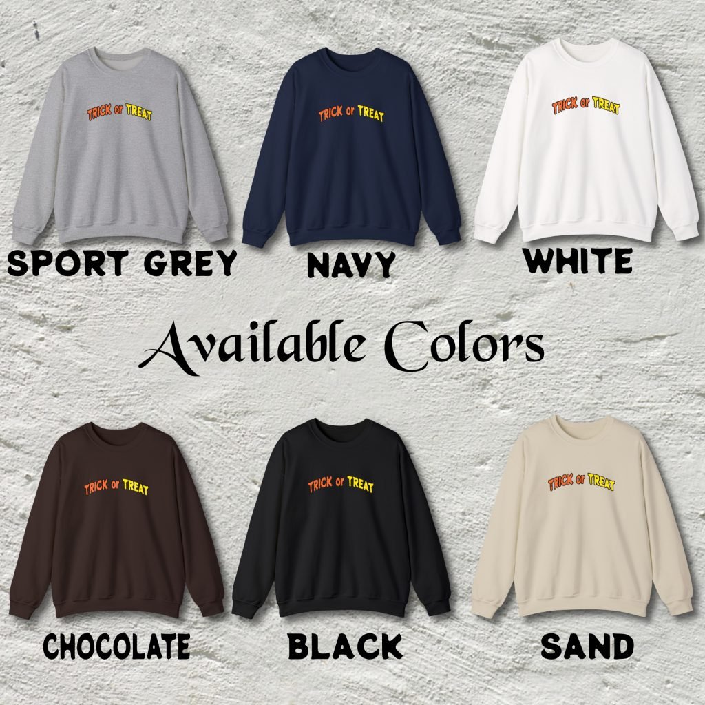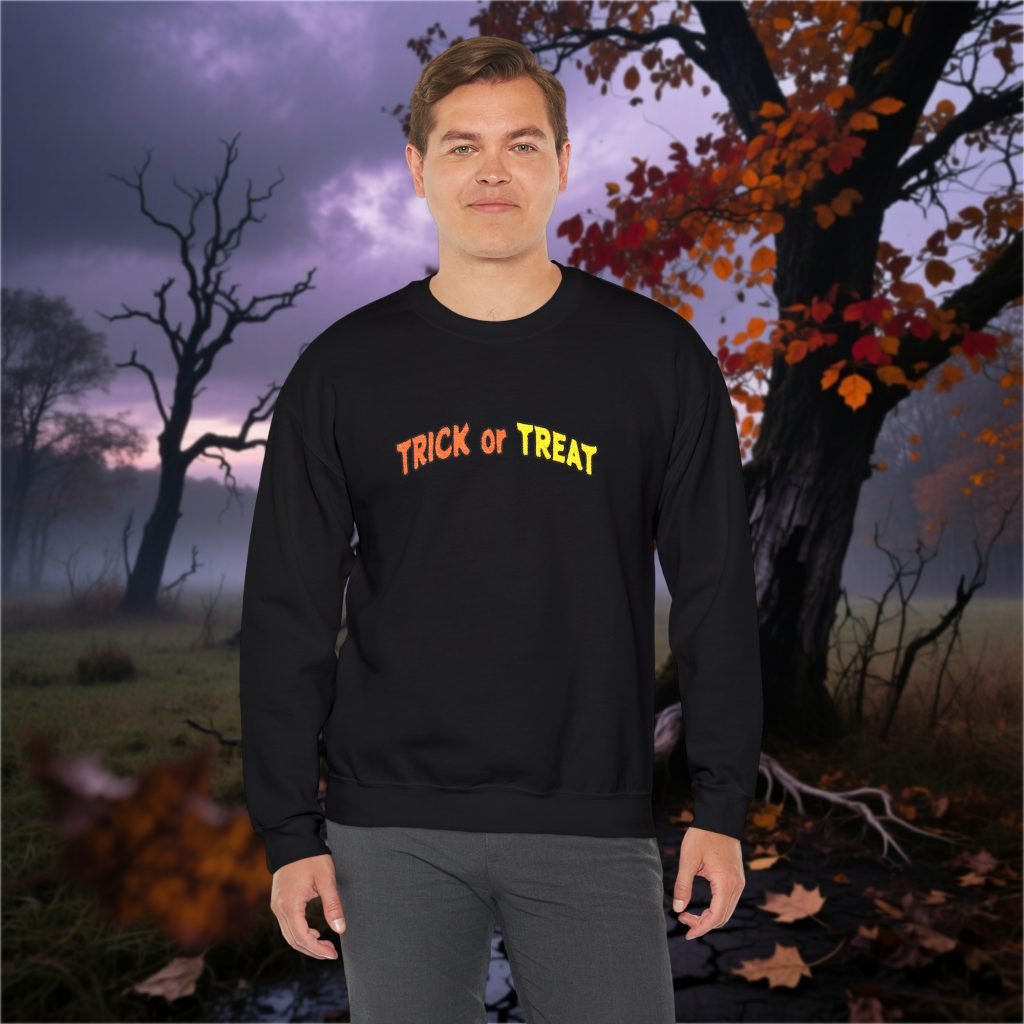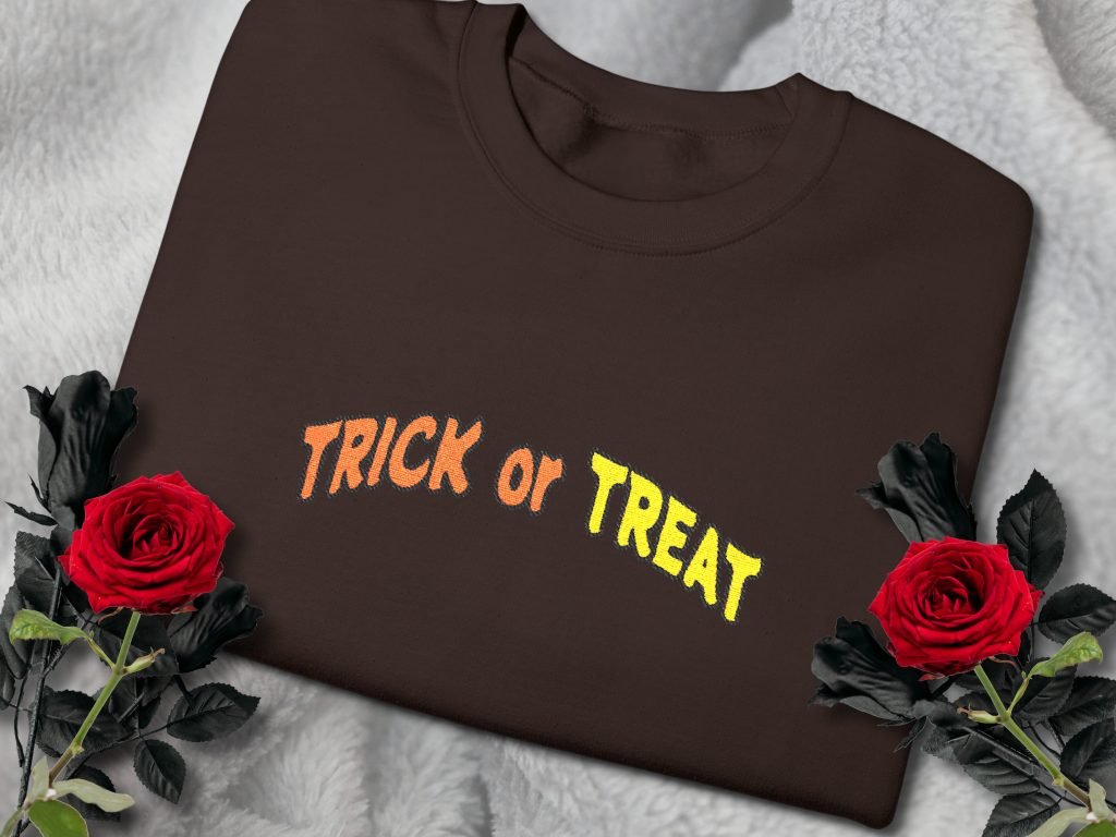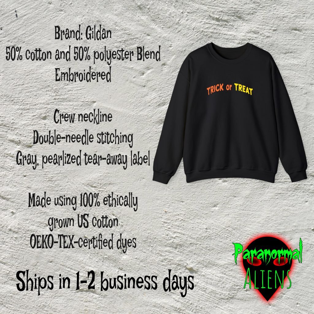 Celebrate Halloween with this embroidered Trick or Treat sweatshirt Gildan 18000 brand. Soft cotton-poly blend, relaxed fit, and stitched spooky charm for horror and goth fans.