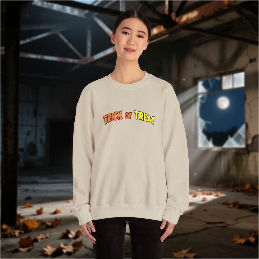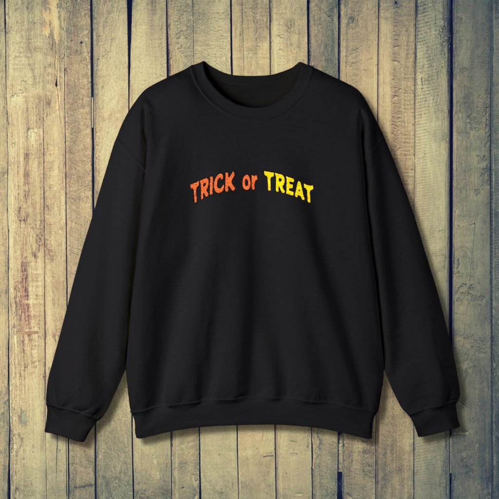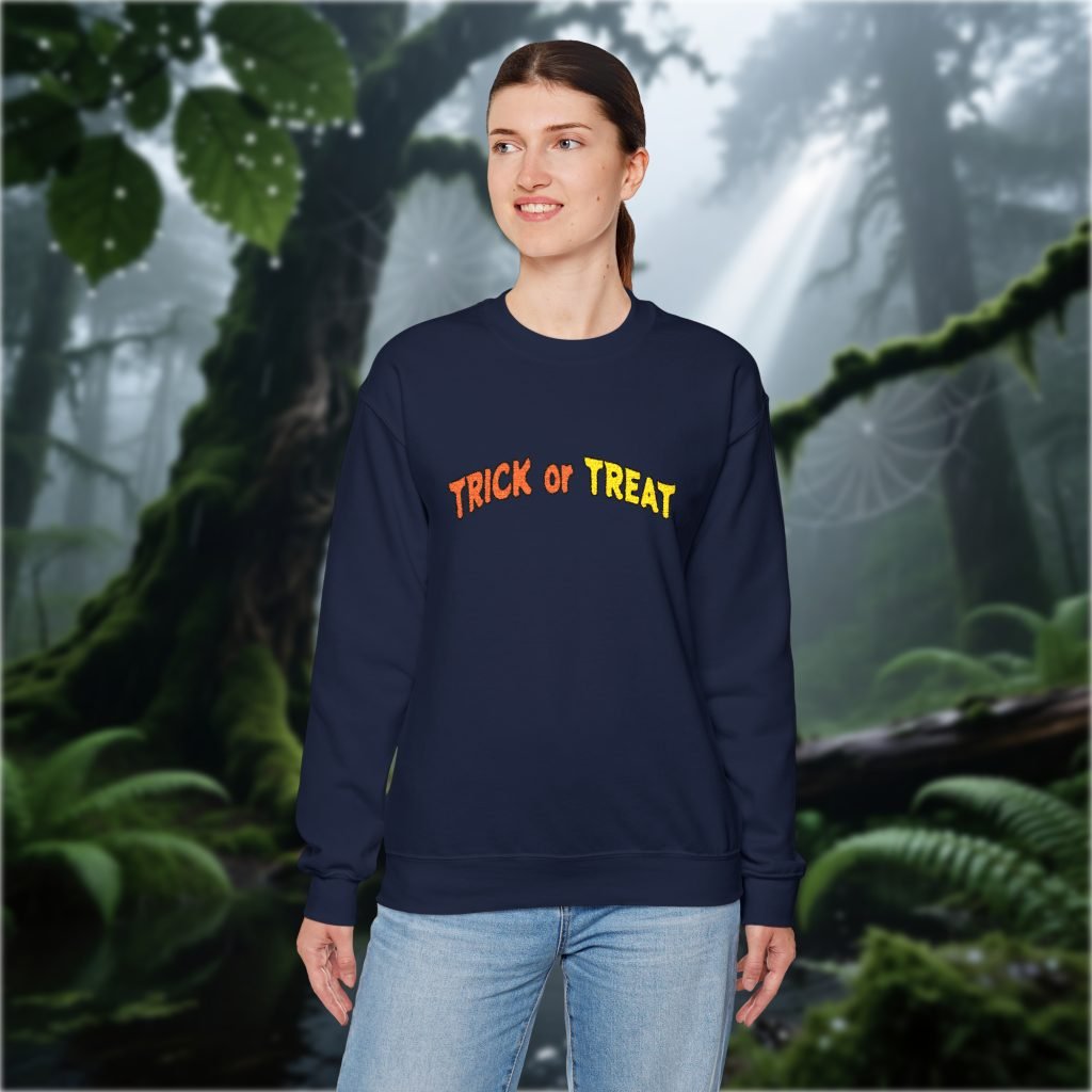 Celebrate Halloween with this embroidered Trick or Treat sweatshirt Gildan 18000 brand. Soft cotton-poly blend, relaxed fit, and stitched spooky charm for horror and goth fans.