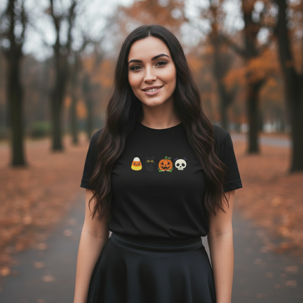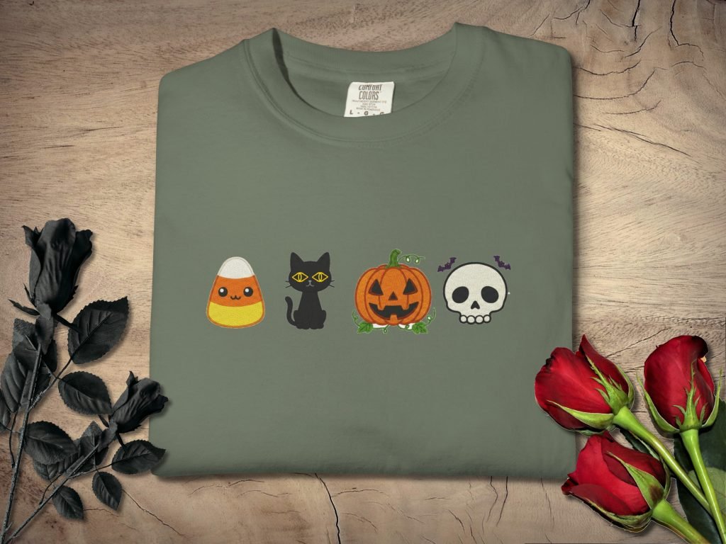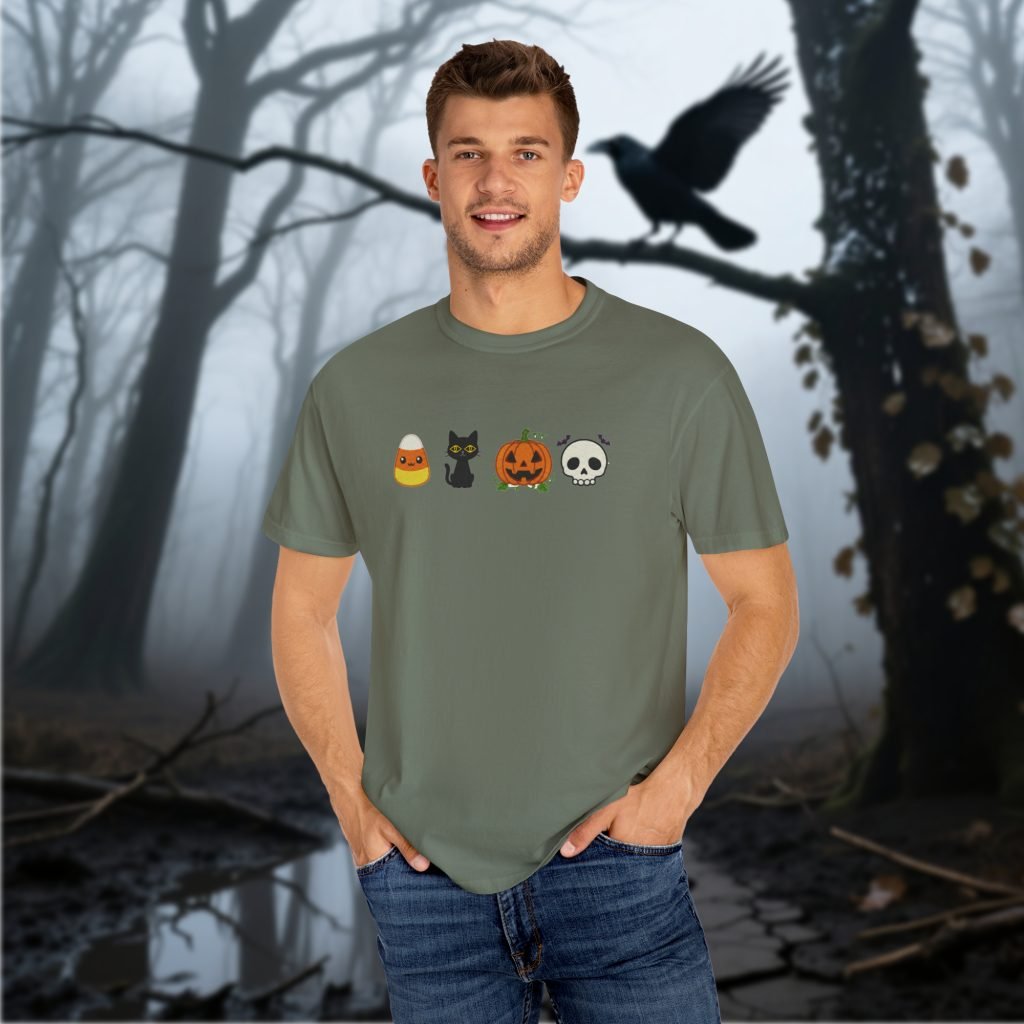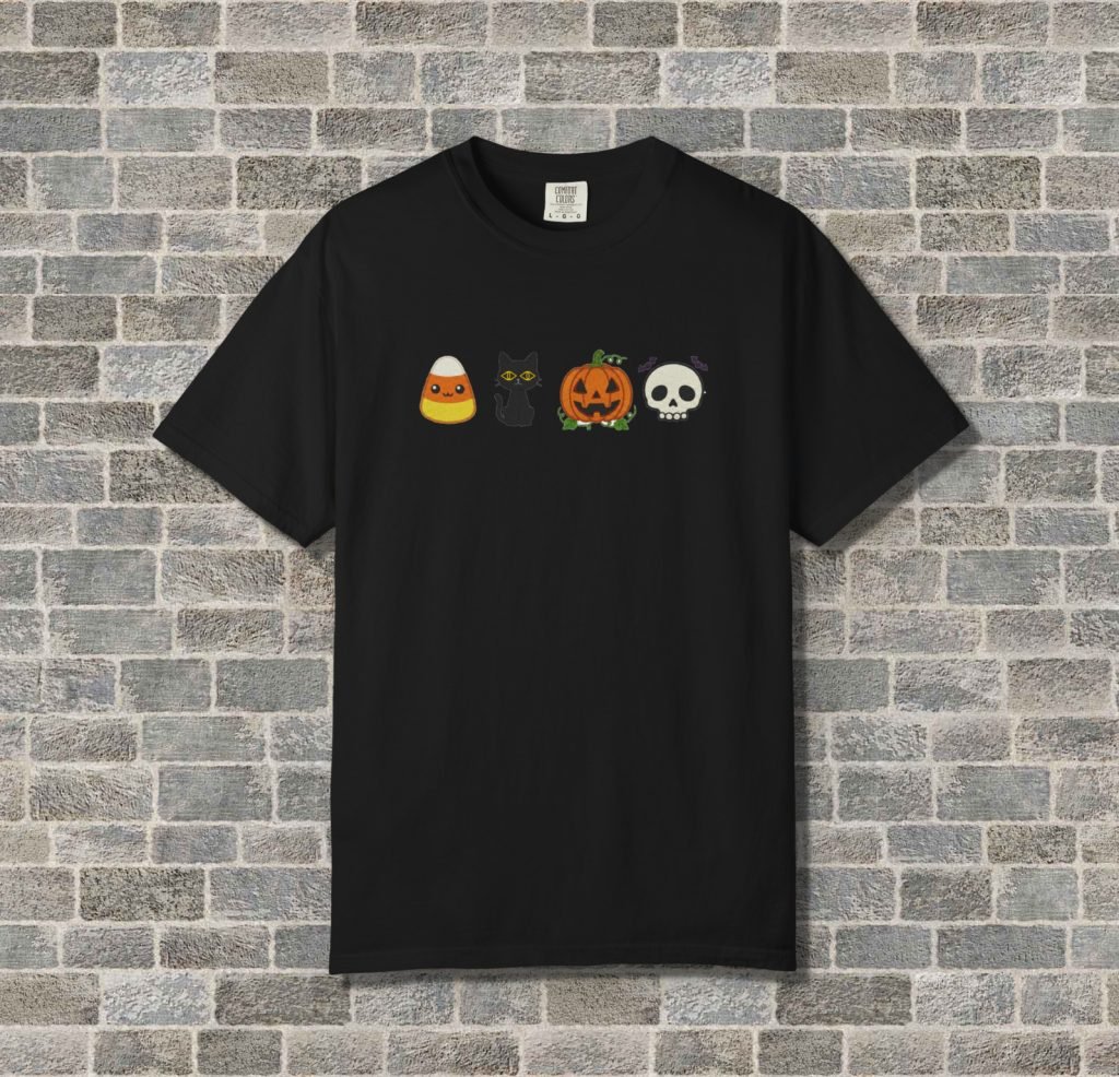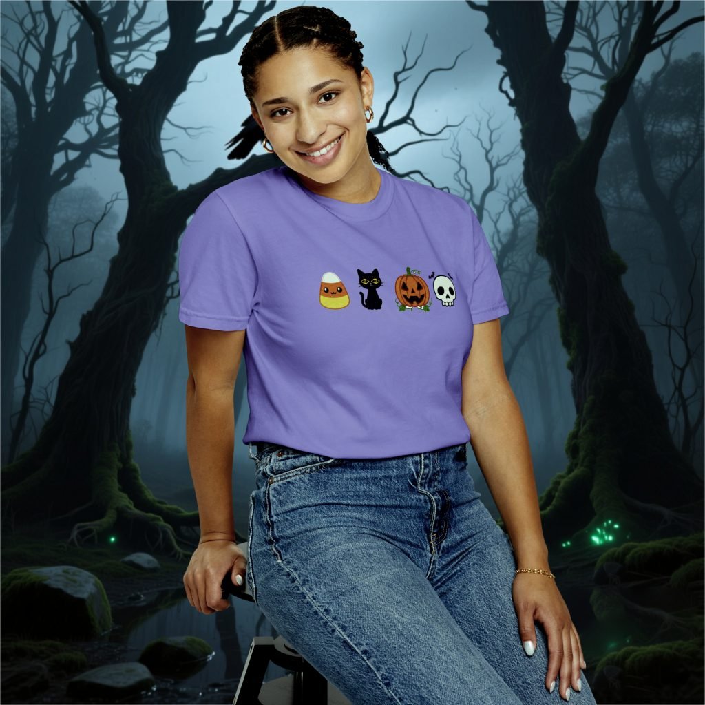 This printed Fall Halloween shirt features cartoon art in a stitched style of a pumpkin, black cat, candy corn, and skull on comfort colors brand. Made with pre-shrunk ring-spun cotton and a relaxed fit for horror and goth fans.