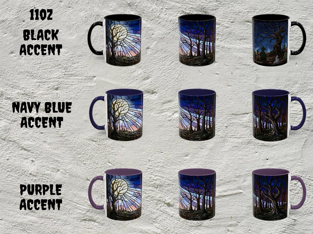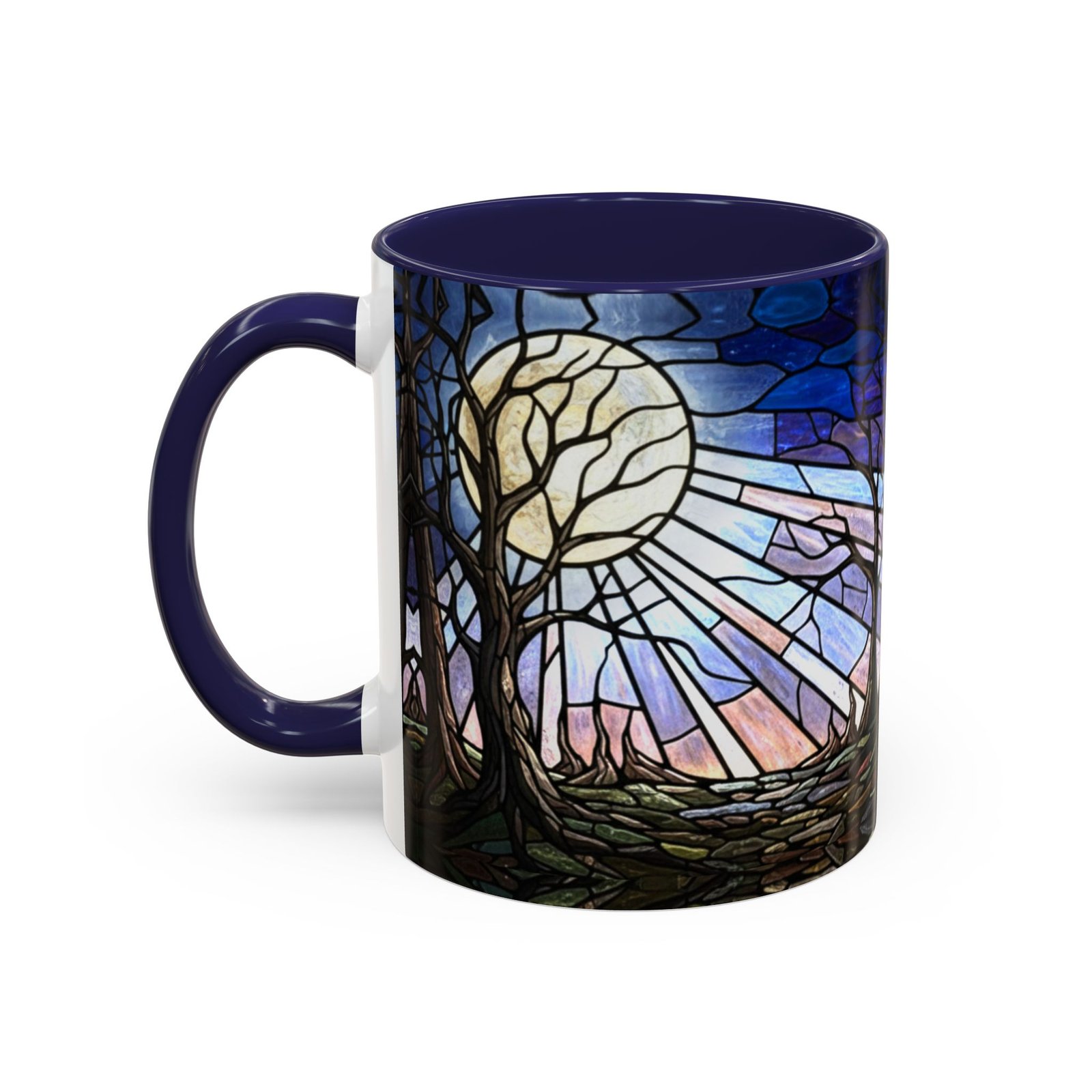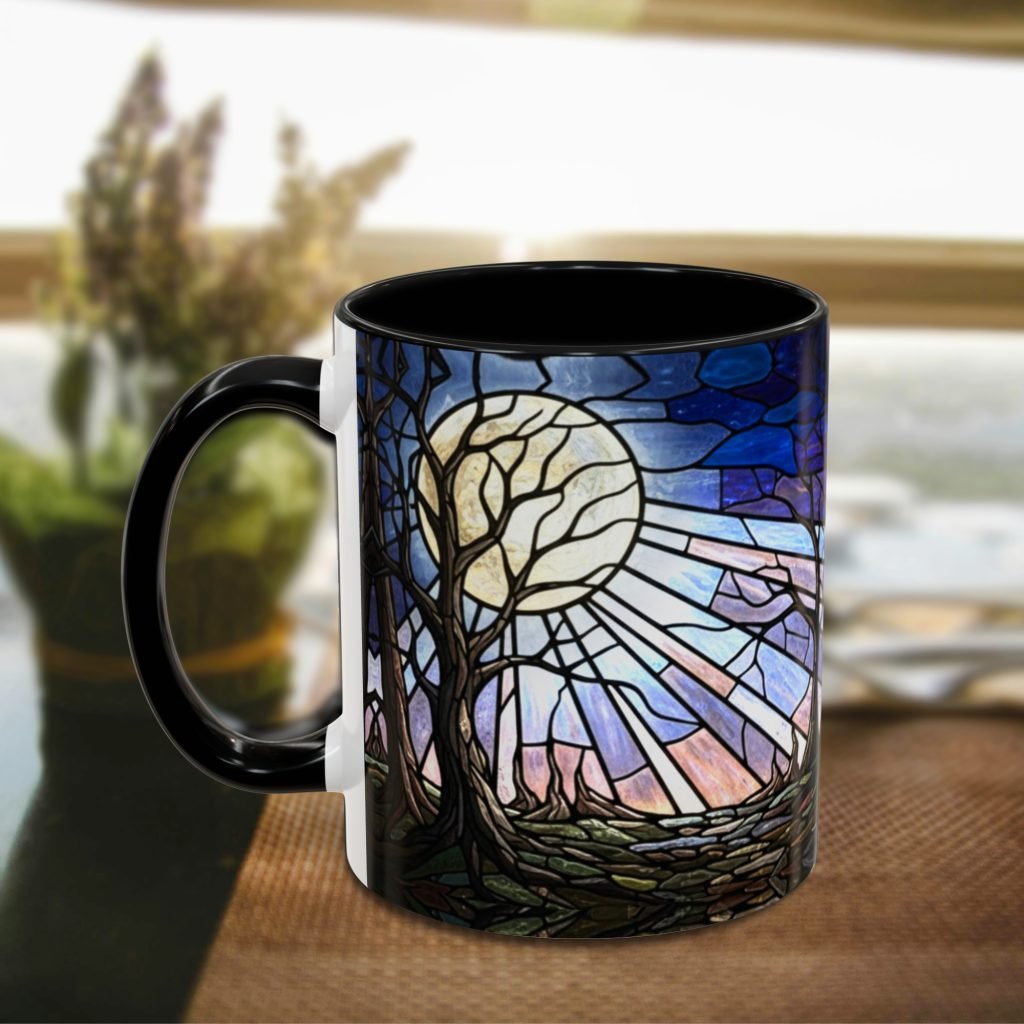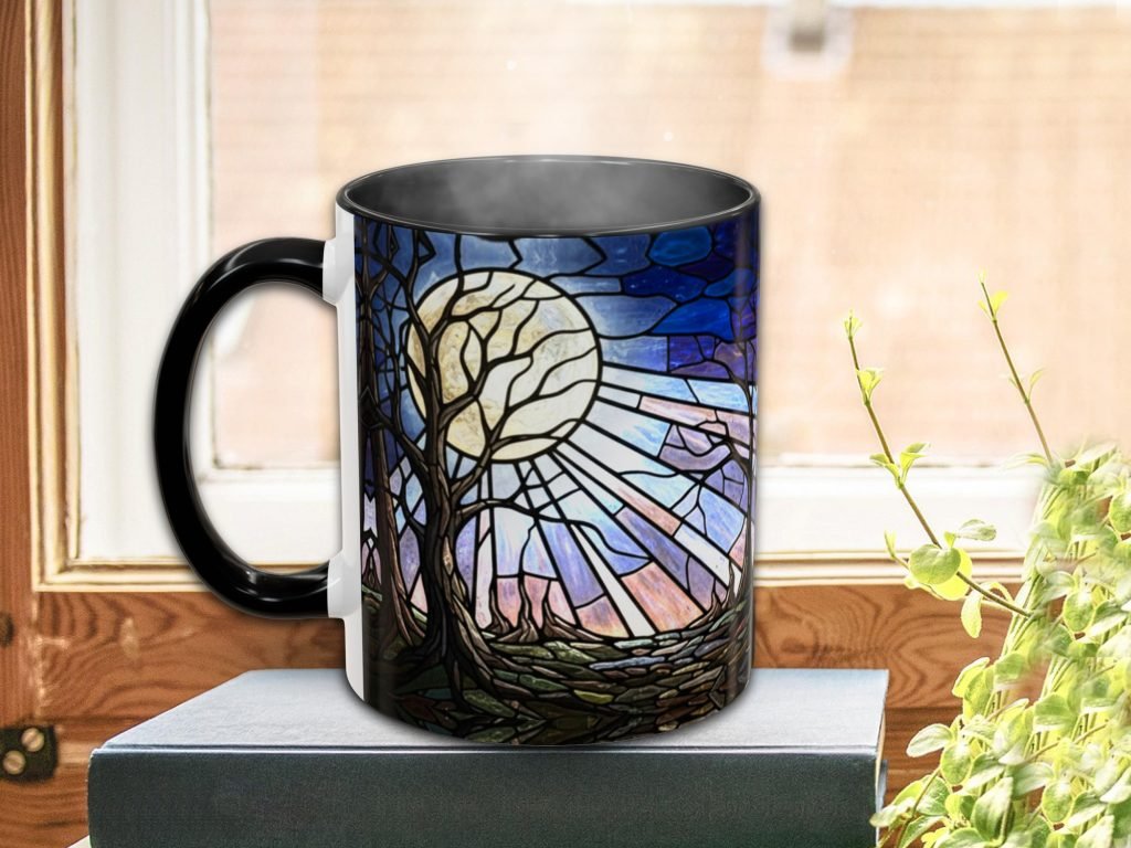 This 11 oz or 15 oz ceramic Stained Glass Coffee Cup features stained glass-style gothic moon artwork—ideal for goth gifting and celestial drinkware lovers. Microwave and dishwasher safe for daily use.