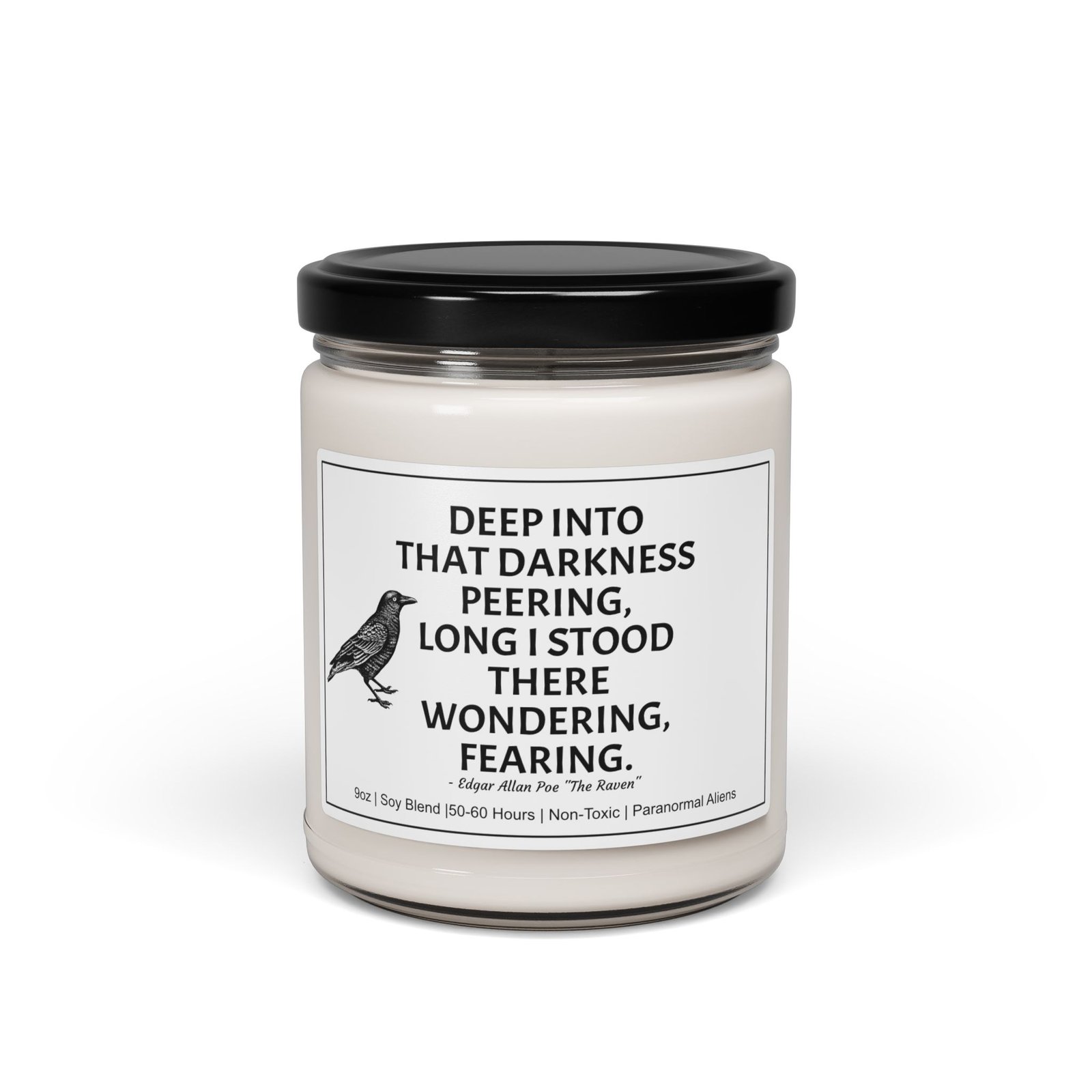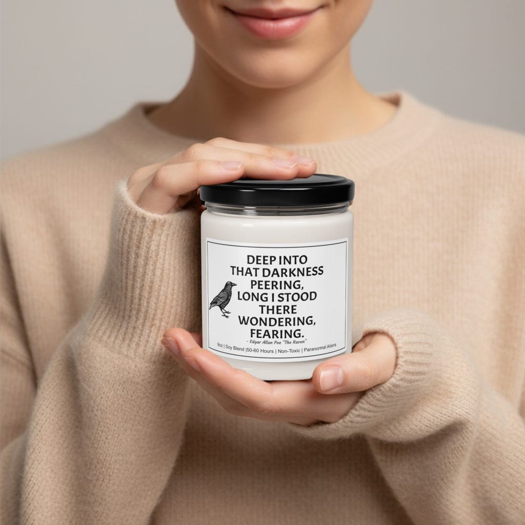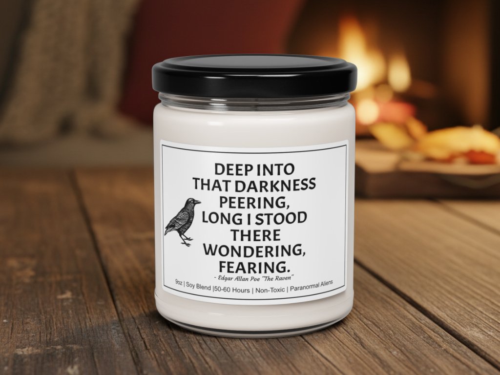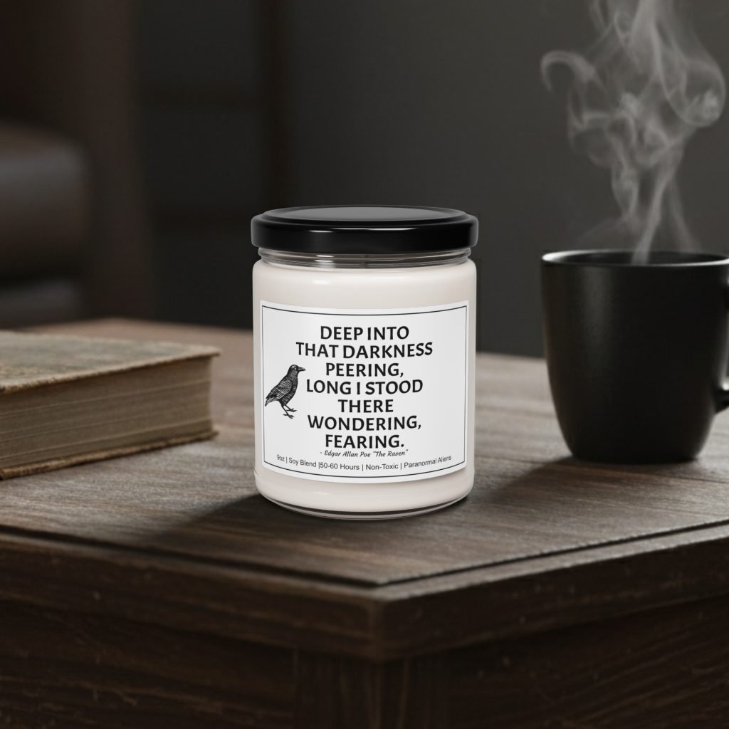 This Gothic Poe Quote Candle features the haunting line “Deep into that darkness peering, long I stood there wondering, fearing.” on a reusable 9oz jar. Made with a soy blend and available in 10 scent options, it’s a moody tribute to Poe’s literary legacy. Ideal for gothic decor, horror lovers, and gifting to those who embrace poetic darkness.