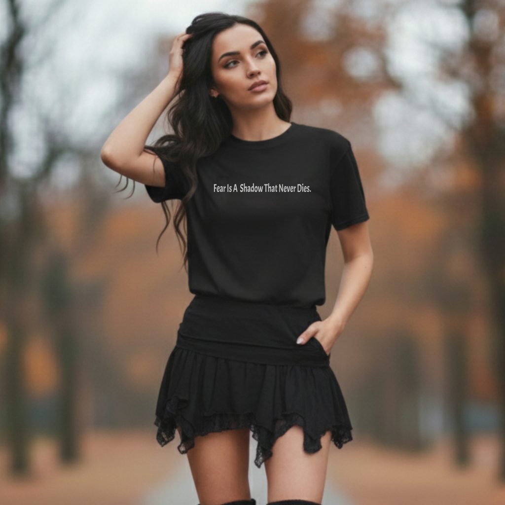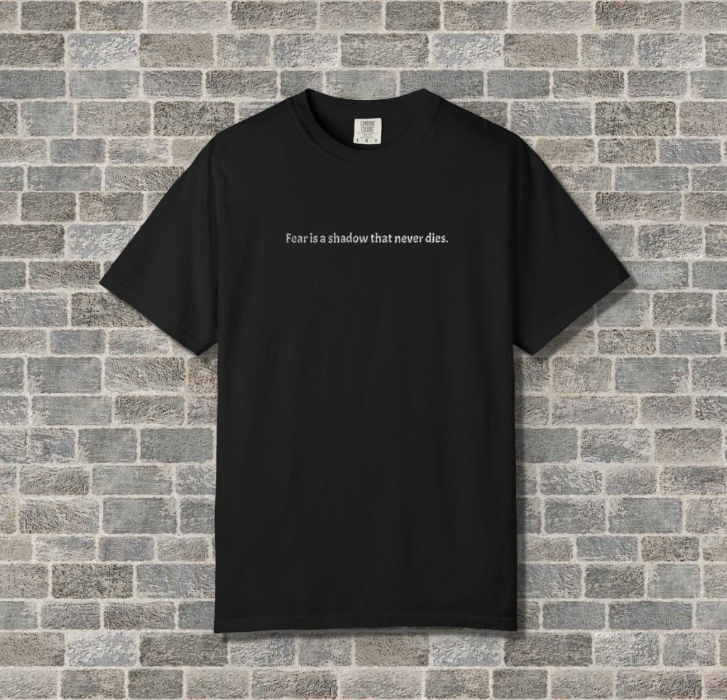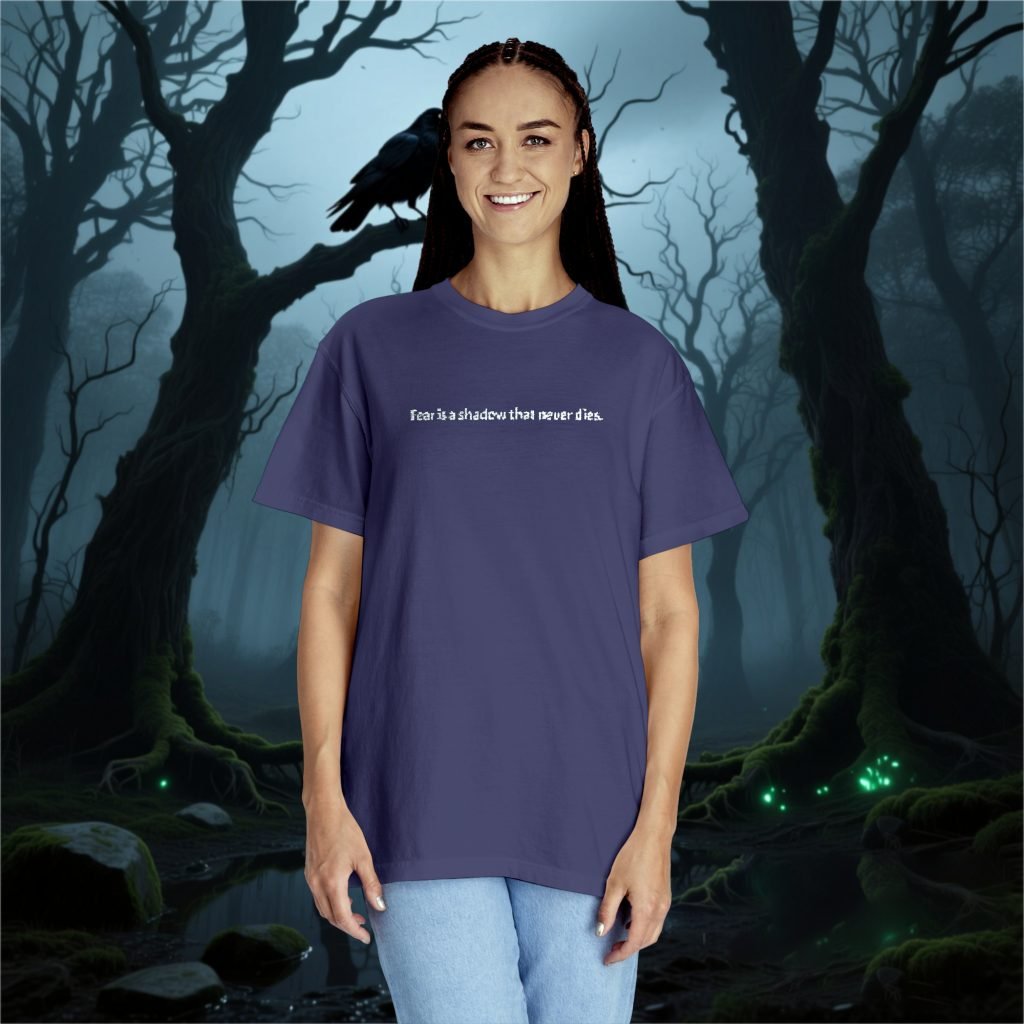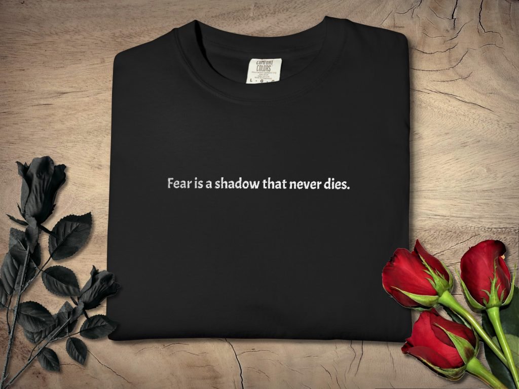 This Gothic Poe T-shirt features the embroidered quote “Fear is a shadow that never dies.” on a relaxed fit Comfort Colors tee. A haunting gift for horror lovers, gothic fashion fans, and Poe enthusiasts drawn to poetic dread and literary darkness.