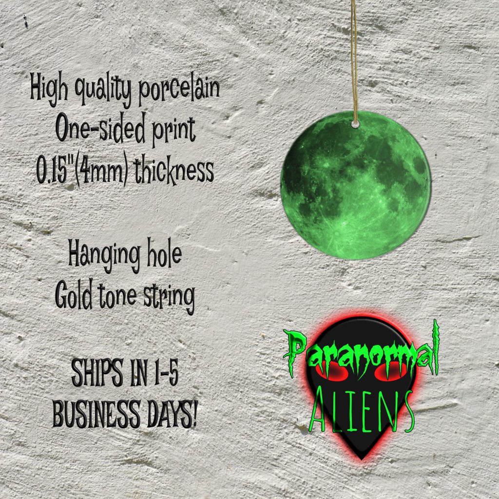 Introducing our captivating Halloween Ornament, the perfect addition to your Gothic decor or Christmas tree. This unique ornament features a green moon made from ceramic, adding a touch of enchantment to your holiday festivities. Suspended by a gold-toned string, it effortlessly blends into any décor theme. Whether you’re looking to embrace the spooky spirit of Halloween or add a touch of darkness to your Christmas tree, this ornament is the ideal choice. It also makes a great horror gift for him, appealing to those who appreciate the macabre. With its eerie green moon design, it exudes a mysterious and creepy vibe, making it the perfect addition to your collection of creepy decor. Elevate your holiday decorations with our Halloween Ornament—a captivating piece that merges the allure of Gothic decor with the joy of the festive season. Embrace the darkness and add a touch of enchantment to your Christmas tree or Gothic-themed displays.