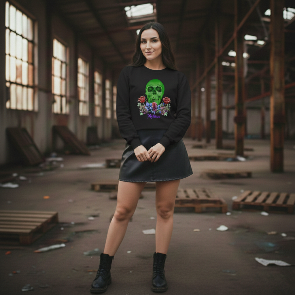 Keep warm on Halloween night with this spooktacular green skull Personalized Sweatshirt! It’s warm, comfortable and will do a great job showing off your dark side. Features a tinted green skull buried in colorful flowers. Perfect for goth clothing or Halloween. Gildan brand custom sweater is made of 50% cotton and 50% polyester making it perfect for all day comfort that is cozy and looks great. Skull Personalized Sweatshirt allows you to customize the text with your own custom name or the name of the gift recipient. More skull colors are available in my shop.