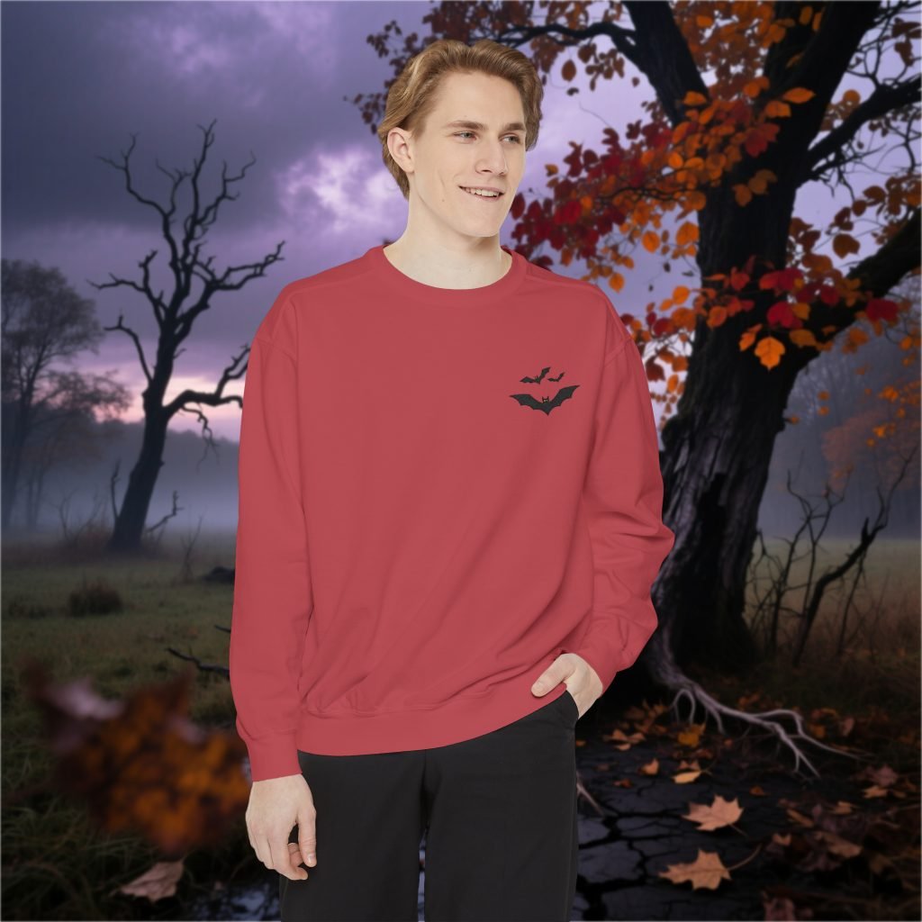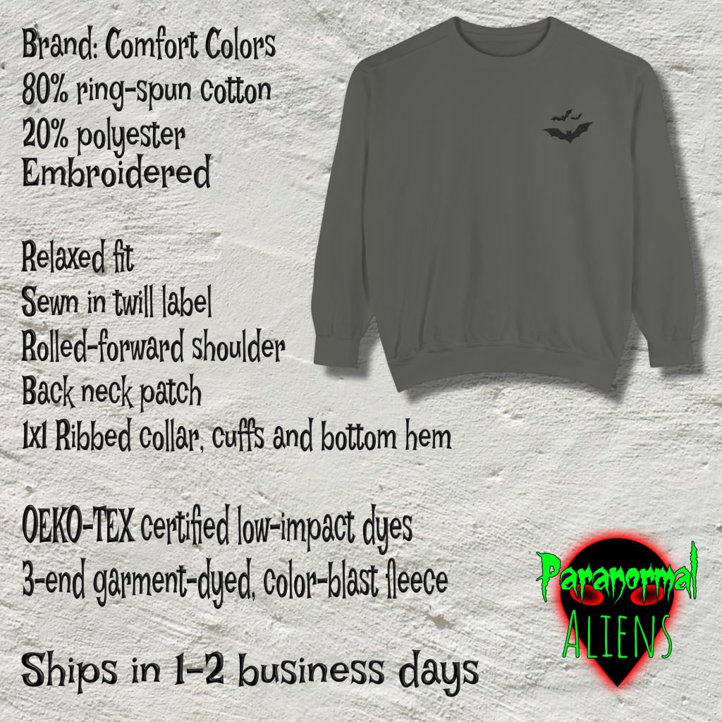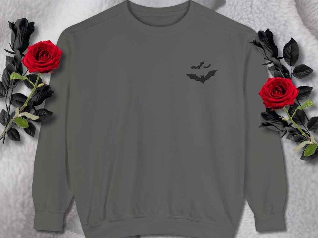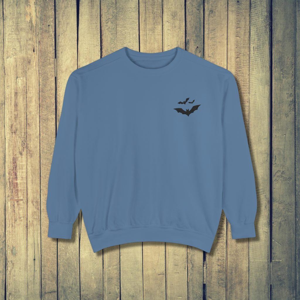 Celebrate spooky season with this embroidered bats sweatshirt in comfort colors brand. Soft cotton-poly blend, relaxed fit, and creepy-cute style for horror lovers and goth gifts.