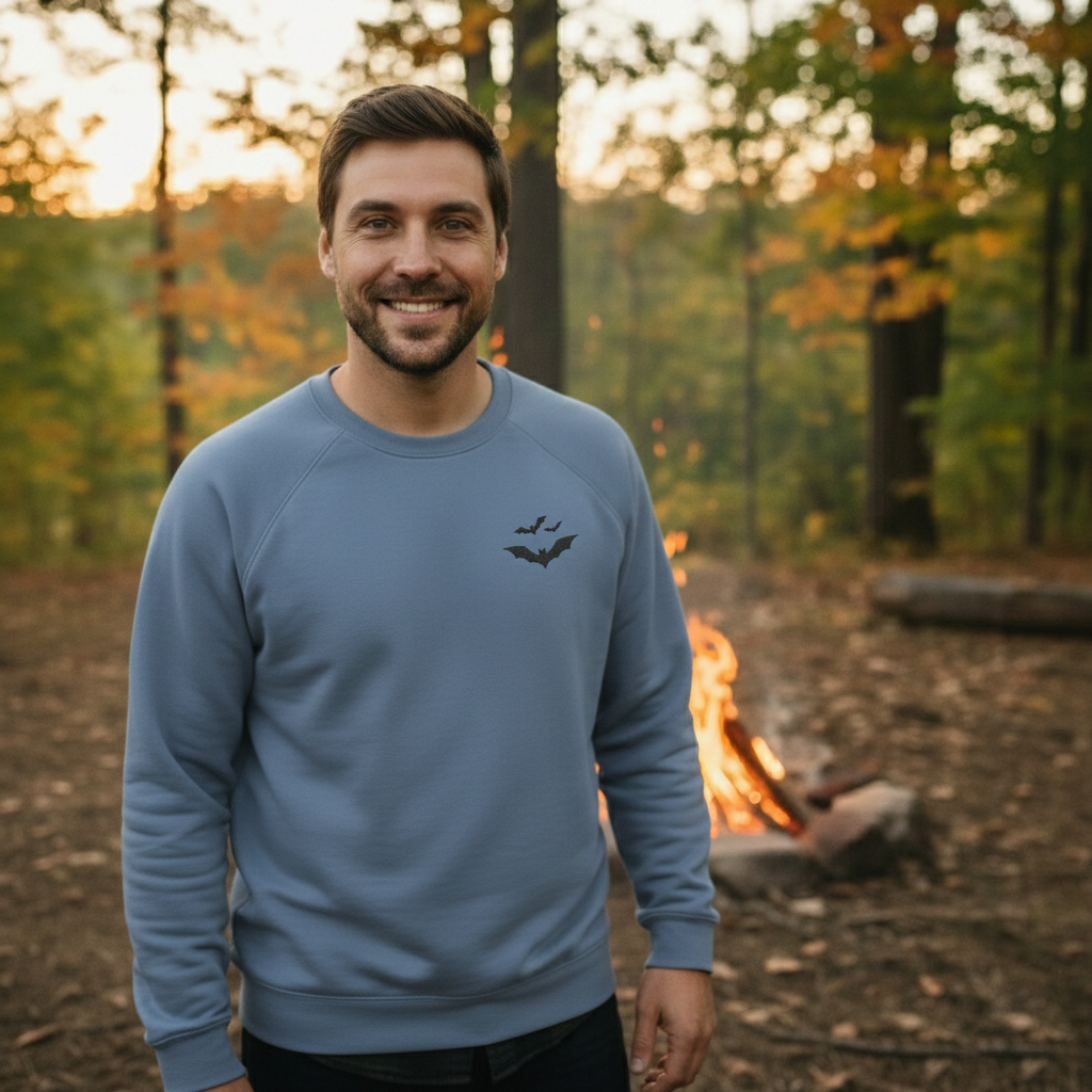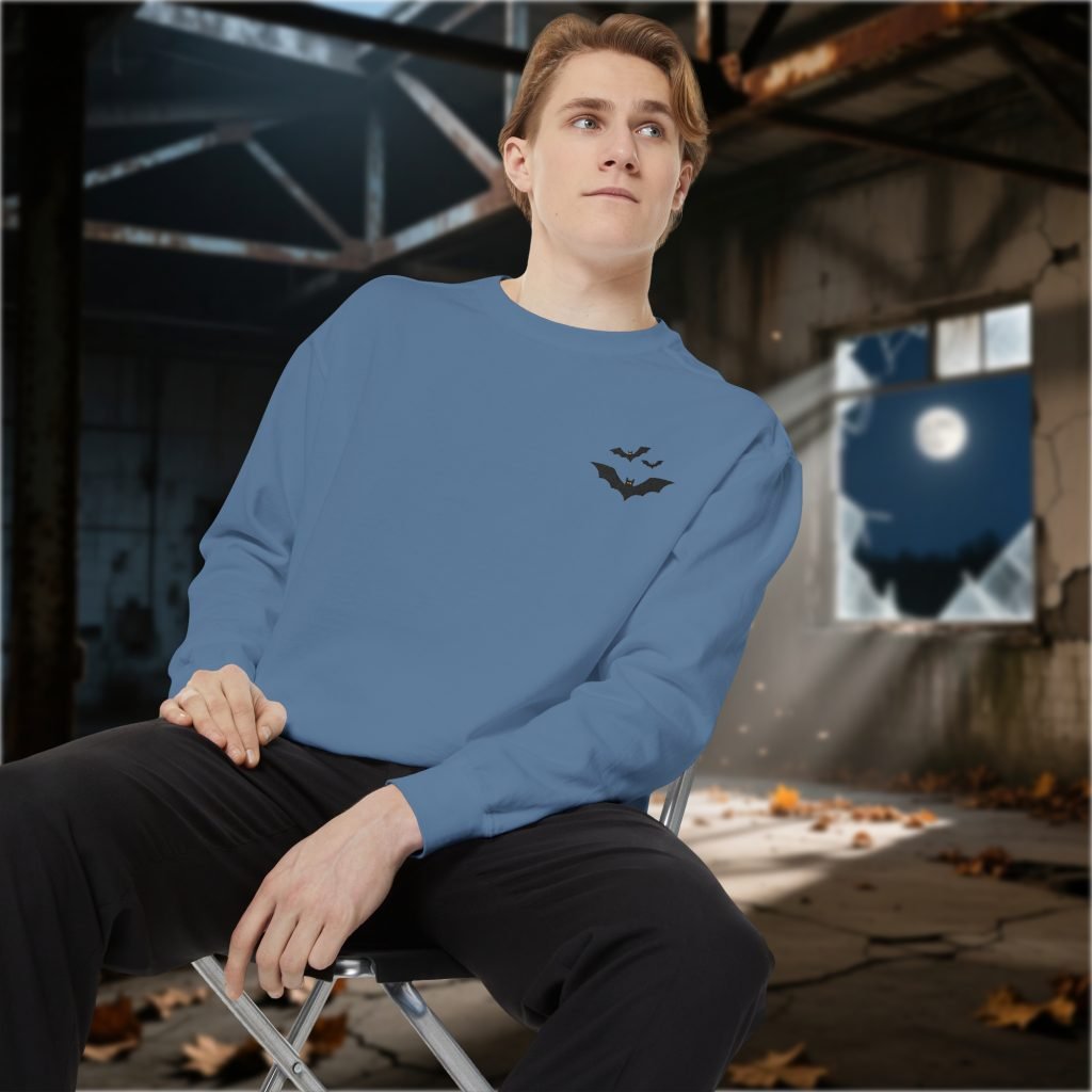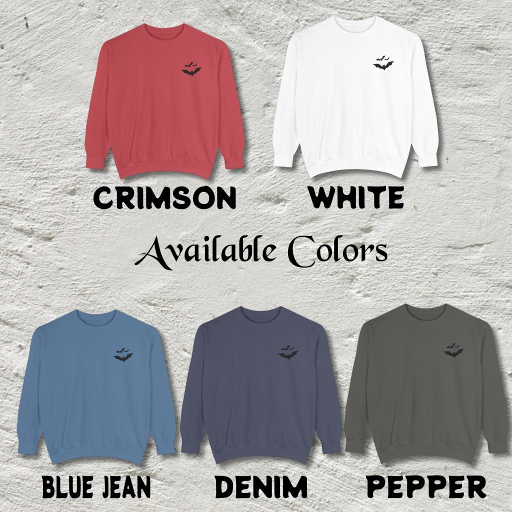 Celebrate spooky season with this embroidered bats sweatshirt in comfort colors brand. Soft cotton-poly blend, relaxed fit, and creepy-cute style for horror lovers and goth gifts.