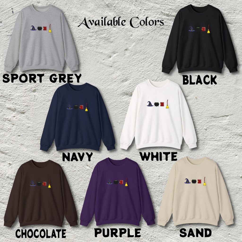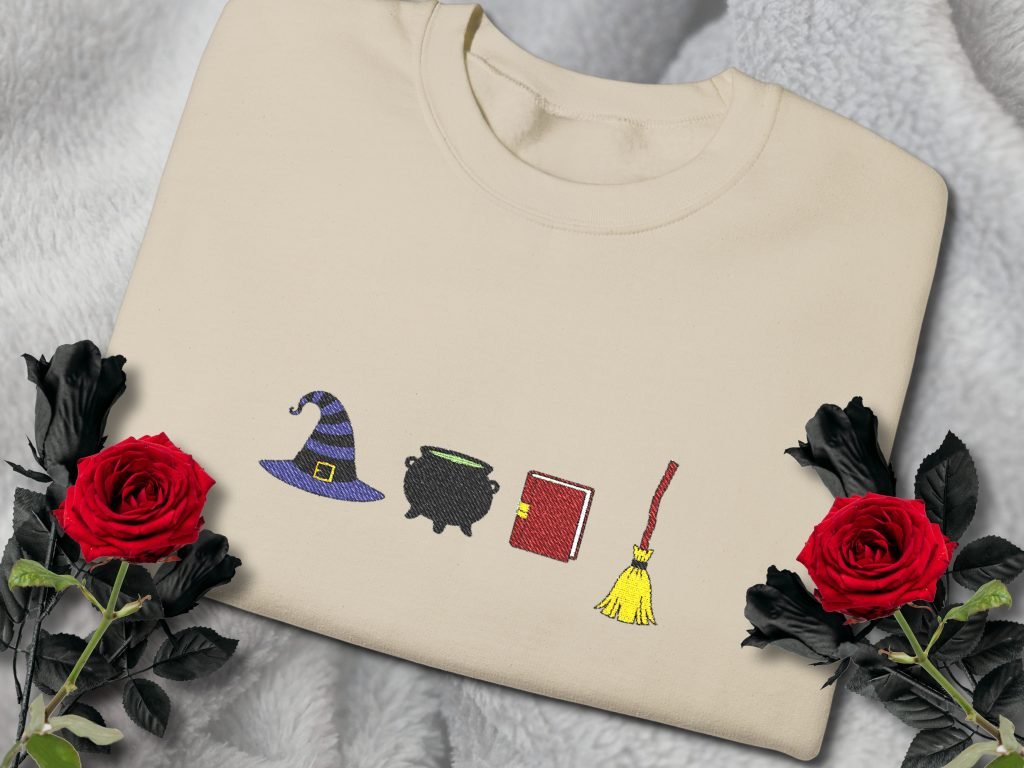 Halloween Embroidered Witch Sweatshirt, Witch Gift for Her, Spooky Sweater, Cauldron Spell Book, Hat and Broom Design
