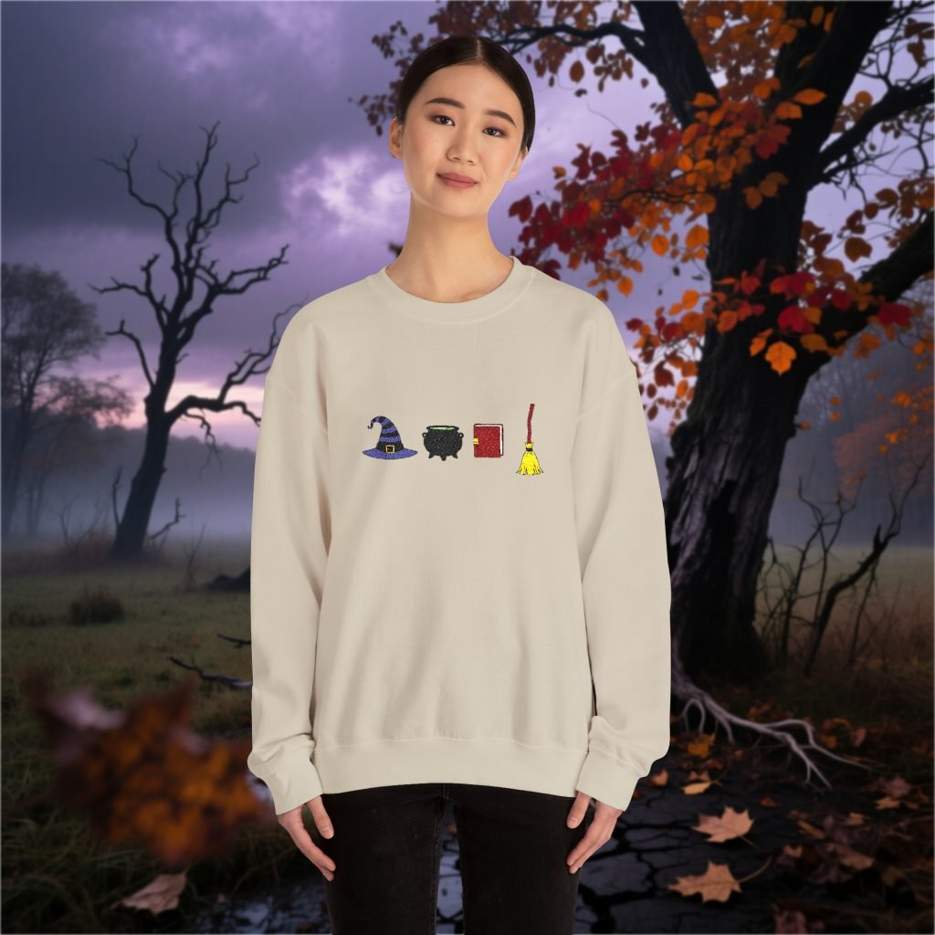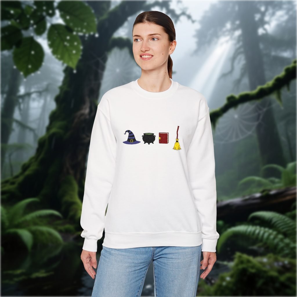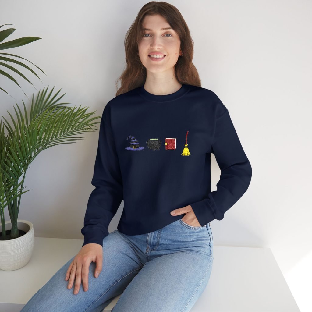 Cozy up in this Halloween Embroidered Witch Sweatshirt featuring a witch’s hat, cauldron, spell, and broom. Relaxed fit, Gildan 18000 brand shirt, ideal gift for her or witchy Halloween fans.