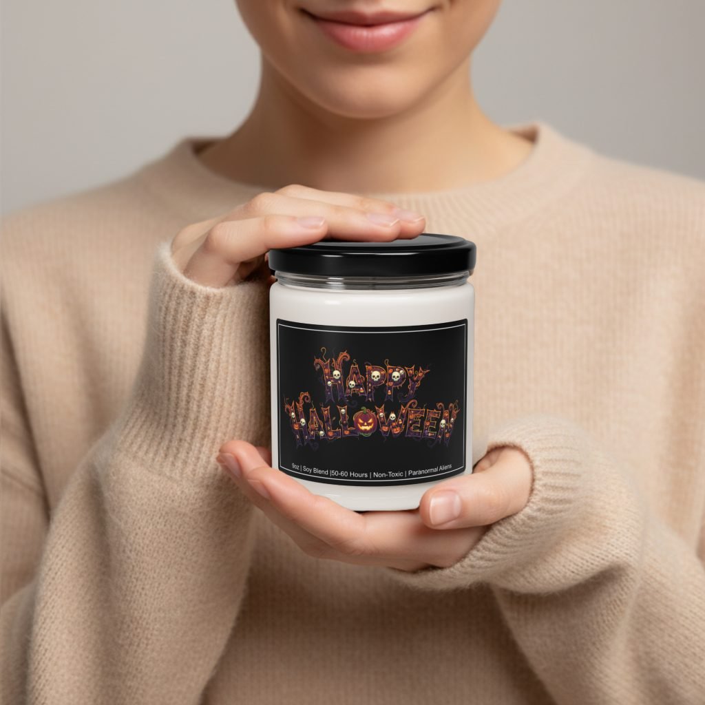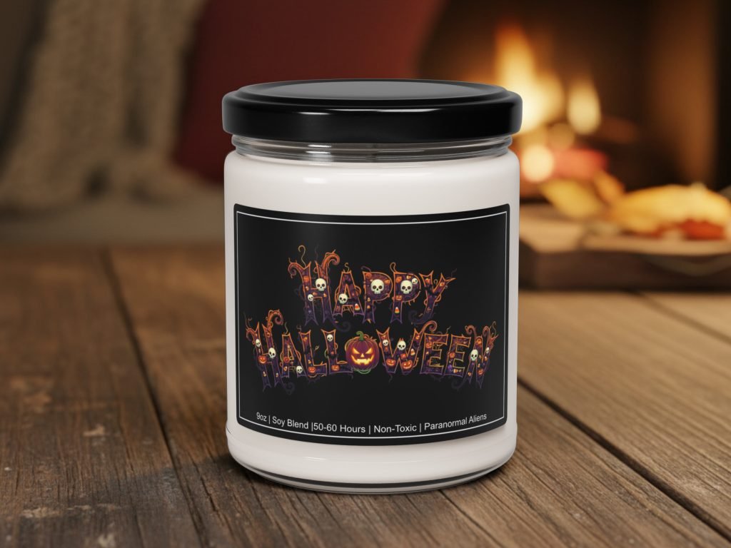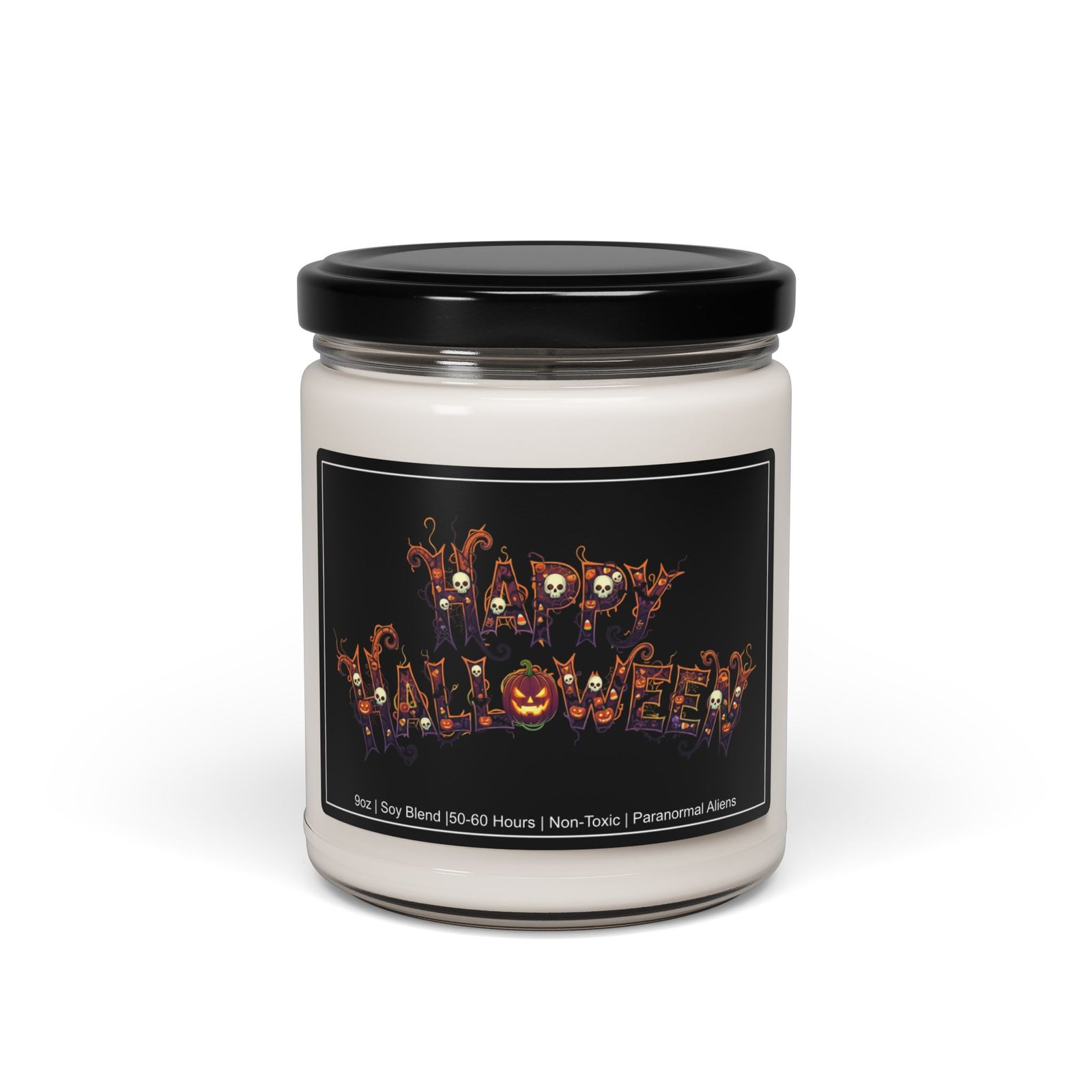 Celebrate Halloween with this festive Happy Halloween Candle featuring spooky text and art. Made with a natural soy wax blend and cotton wick, it comes in a reusable 9oz jar with 10 scent options—ideal for gifting or seasonal decor.