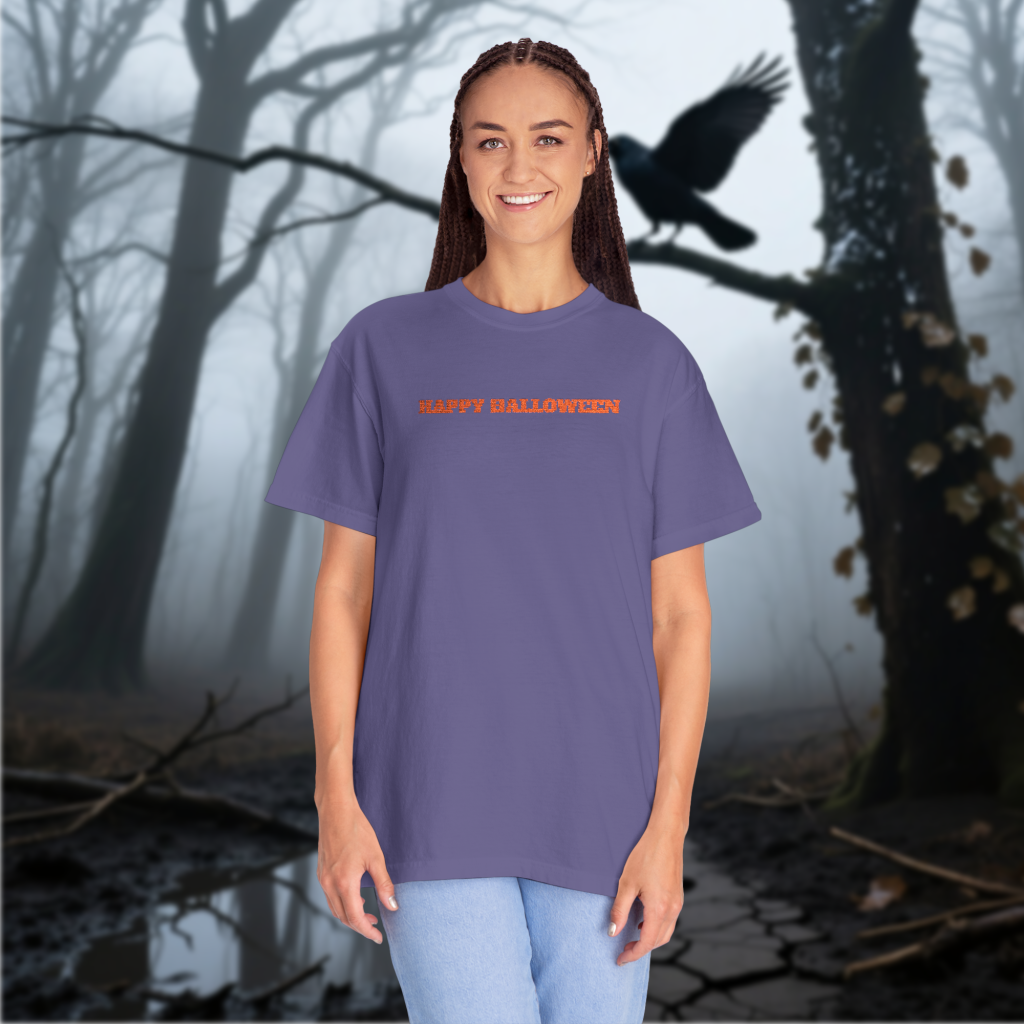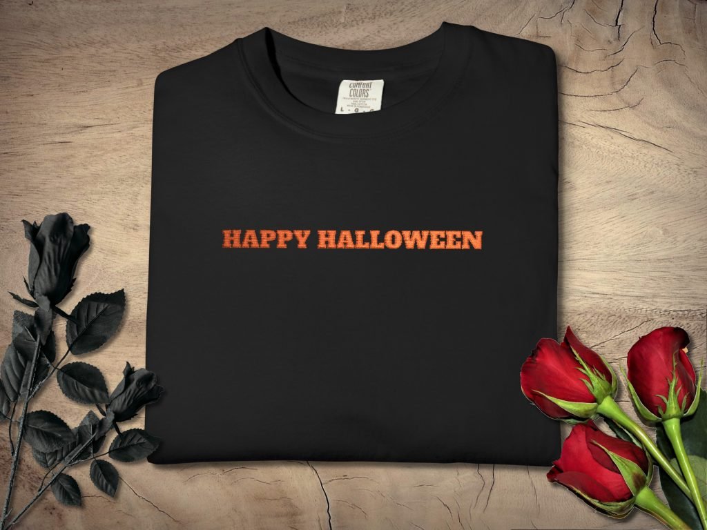 This Halloween Embroidered Shirt features stitched Happy Halloween text on comfort colors t-shirt. Made with pre-shrunk ring-spun US cotton and a relaxed fit for spooky season gifting and horror fans.