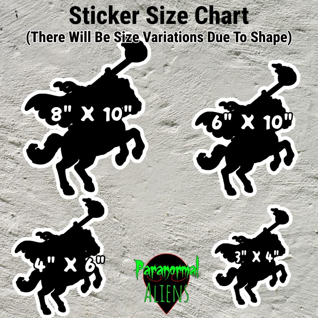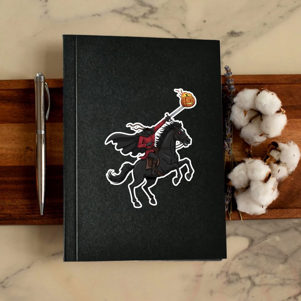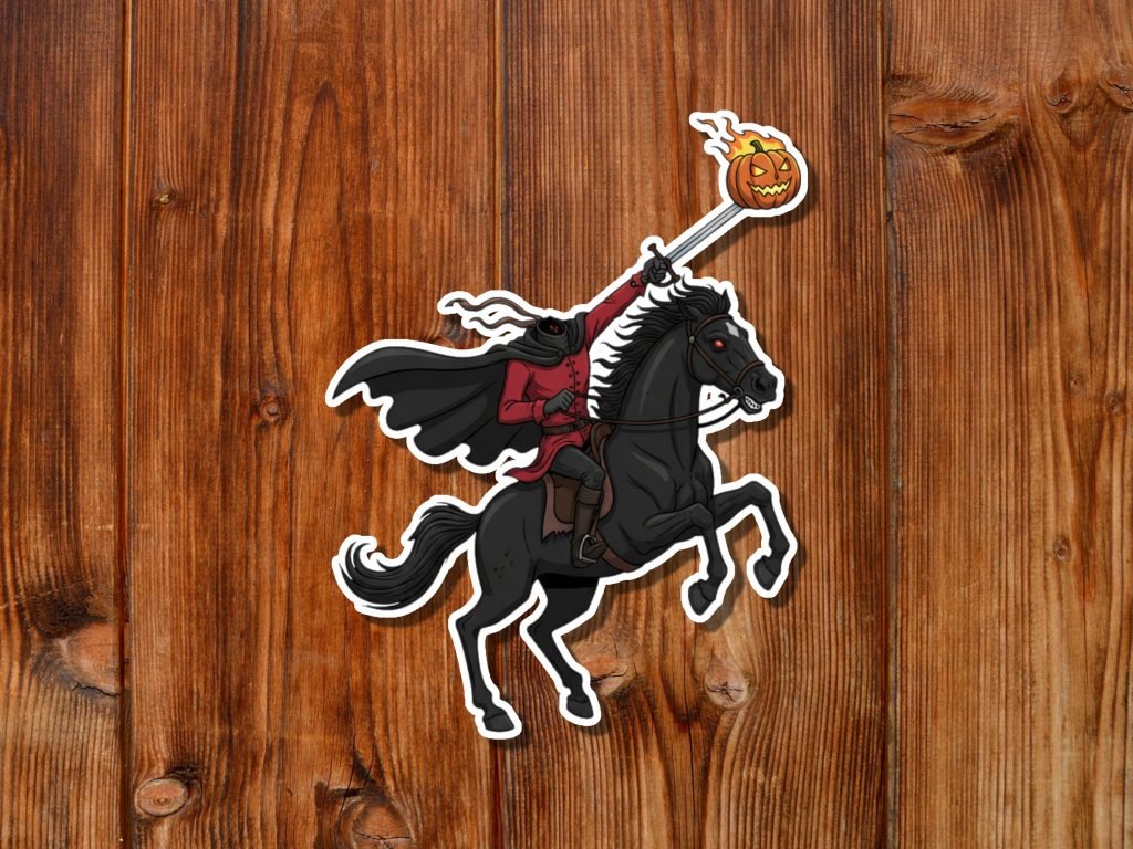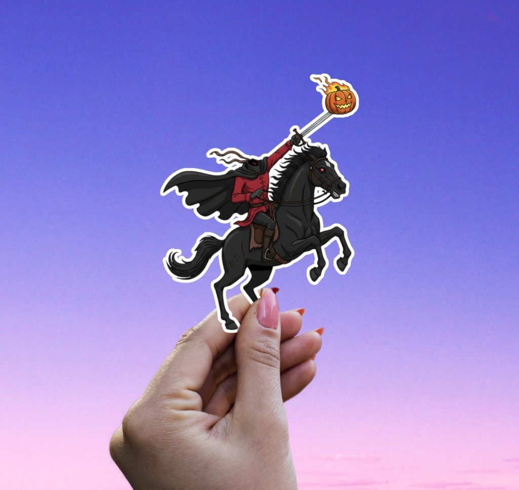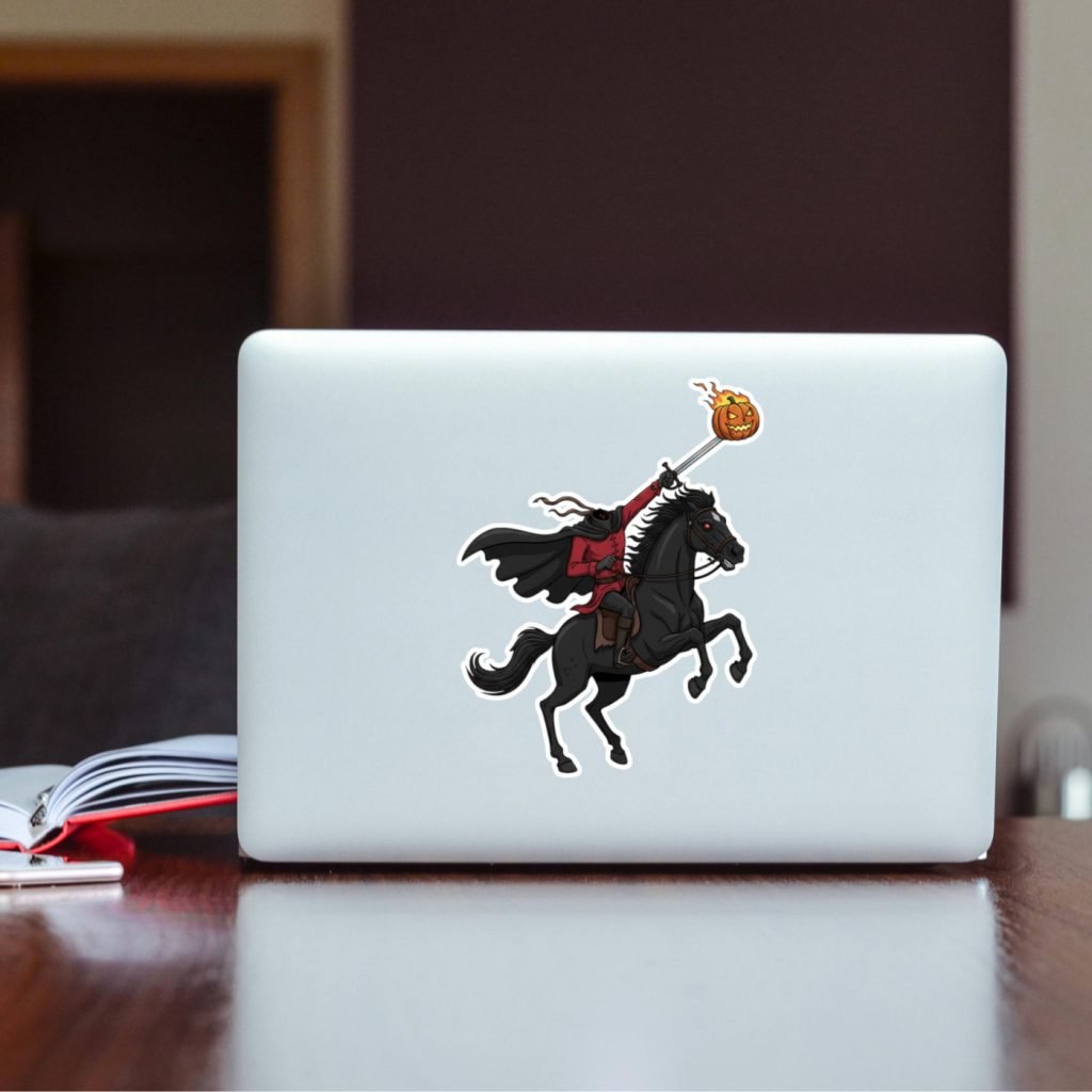 This Headless Horseman Sticker features a flaming pumpkin and bold gothic design. Waterproof vinyl with vibrant colors, satin finish, and kiss-cut edges. Great for horror fans and Halloween tech decor.