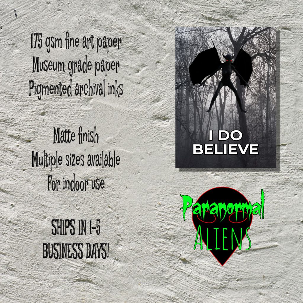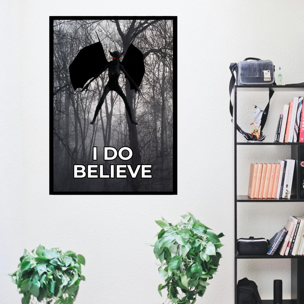 Unveil the mysterious with our Mothman Poster, a chilling depiction of a creature seen by many before horrifying tragic events all around the world. Is it warning us or is it the grim reaper? This paranormal Mothman Print boldly features the horrifying cryptid alongside the powerful proclamation, “I Do Believe,” for all true believers. This is one gothic poster that will terrify your guests and having them run for exits. Whether you’re a paranormal fan, a cryptozoology lover, or drawn to the darkest shadows, this Mothman Poster is a must-have for those who seek to embrace the spooky and the mysterious and truly believe The Mothman is real and perhaps other cryptids as well. Perfect for those who relish the mysteries of the paranormal, let this creepy poster be a compelling addition that transforms your living space into a haven of the darker side of life. With its dark aesthetic and bold declaration, our Mothman Poster stands as a captivating and memorable piece, illustrating the belief in the supernatural and making it a unique gift that resonates with those who appreciate the eerie and mysterious.