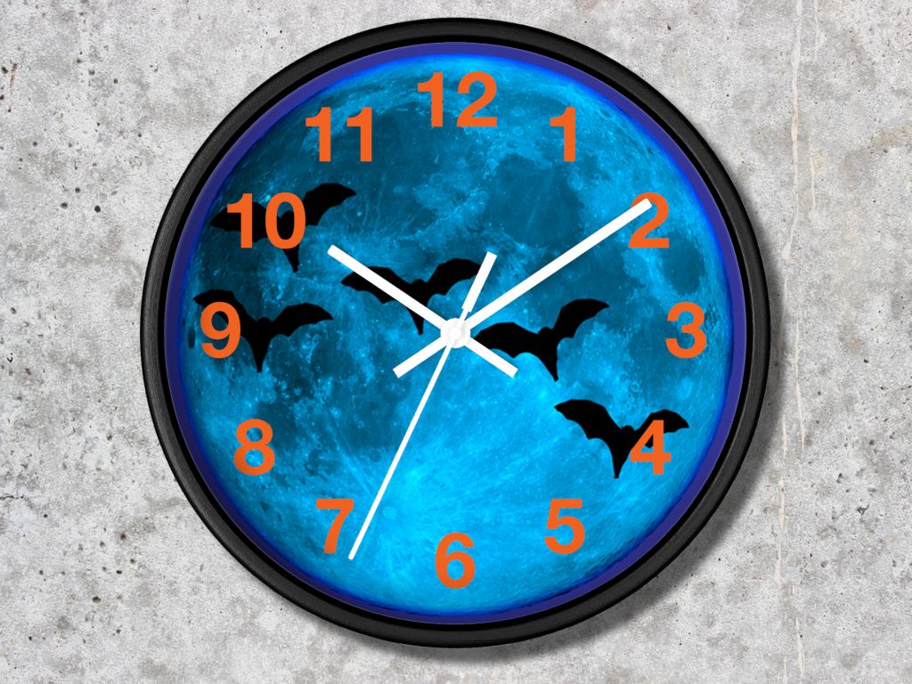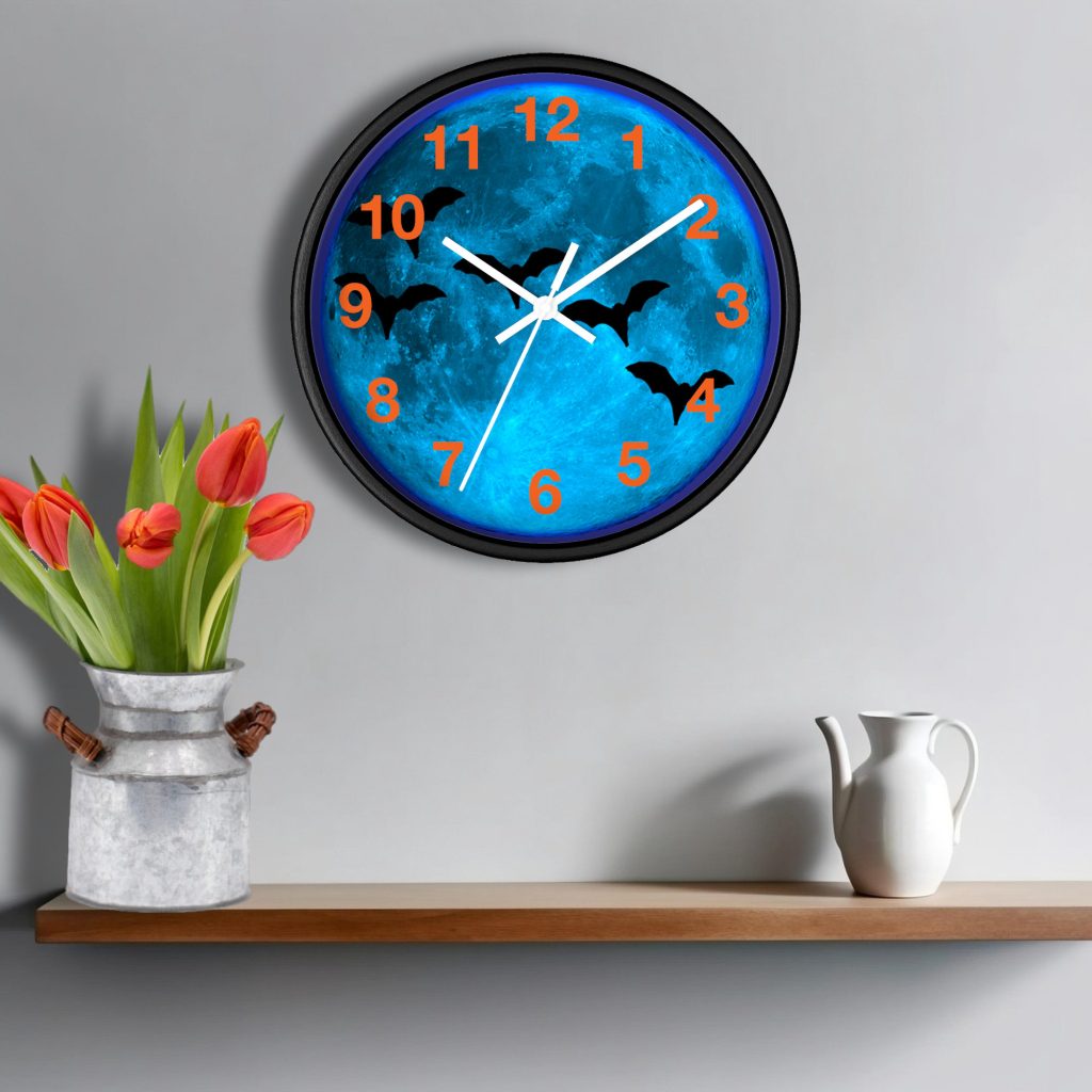 Elevate your Halloween decor with our enchanting Blue Moon Clock. This captivating piece resembles a full moon, bathed in a mystical blue hue, while bats gracefully soar across its surface. It’s the perfect addition to your fall room decor.