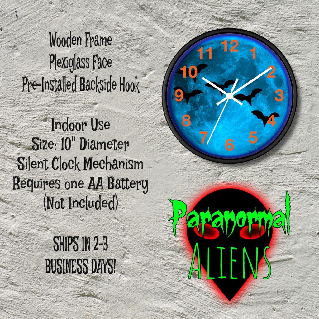 Elevate your Halloween decor with our enchanting Blue Moon Clock. This captivating piece resembles a full moon, bathed in a mystical blue hue, while bats gracefully soar across its surface. It’s the perfect addition to your fall room decor, infusing your space with a touch of eerie elegance. Not only does it serve as a remarkable Halloween decoration, but Horror Clock also doubles as a unique gift idea for horror enthusiasts. With its exquisite design, this clock seamlessly combines function with goth wall art, making it an essential item for any goth-inspired space. Embrace the allure of the night and let the Blue Moon Clock become the focal point of your room. Indulge in the enchantment of this horror clock, designed to captivate your imagination and evoke a sense of mystery. Add a touch of gothic elegance to your space with this exceptional and mesmerizing Blue Moon Clock.