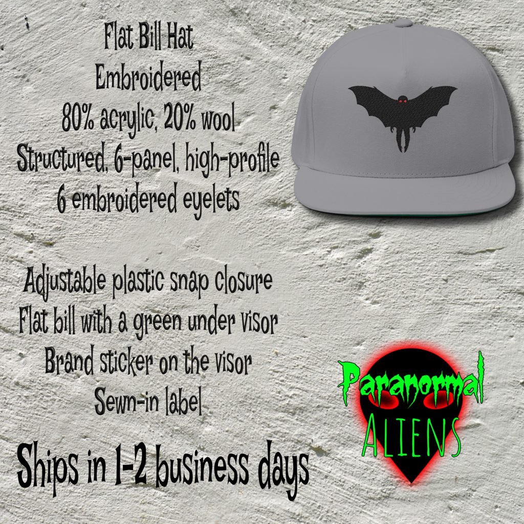 This Mothman embroidered Cryptid hat is built for cryptid chasers and horror fans. Featuring a flat bill, sewn-in label, and adjustable fit, it’s a bold acrylic/wool cap that blends mystery with streetwear.