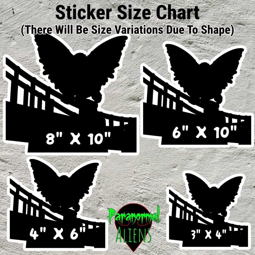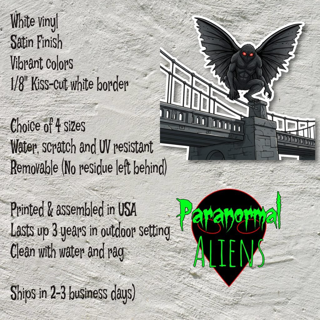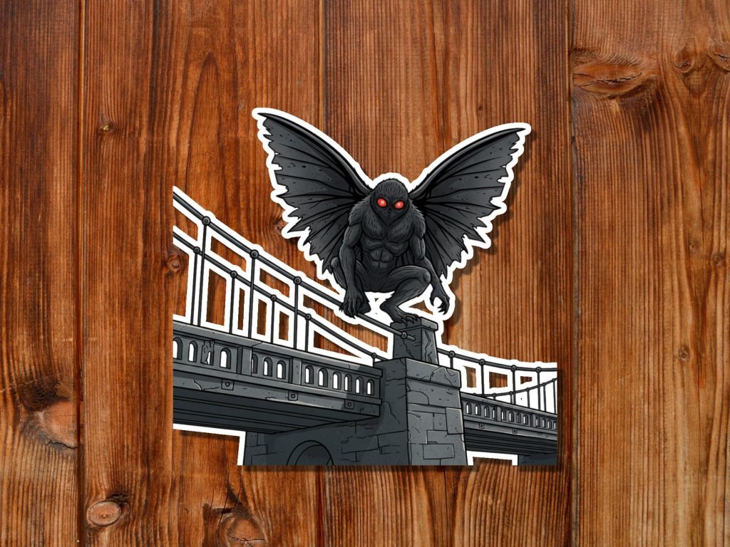 This Mothman Vinyl Sticker features vibrant colors, a satin finish, and kiss-cut edges with white borders.