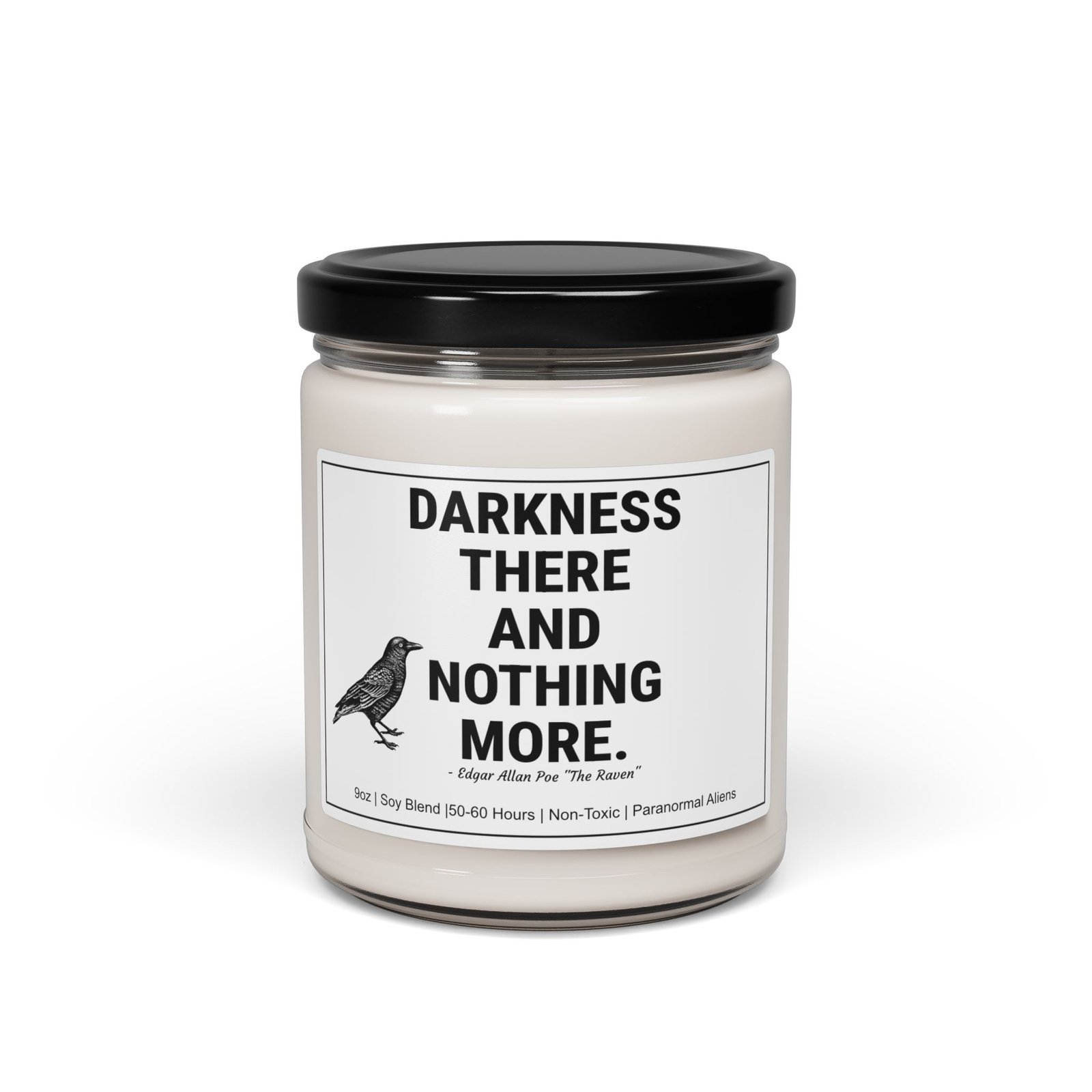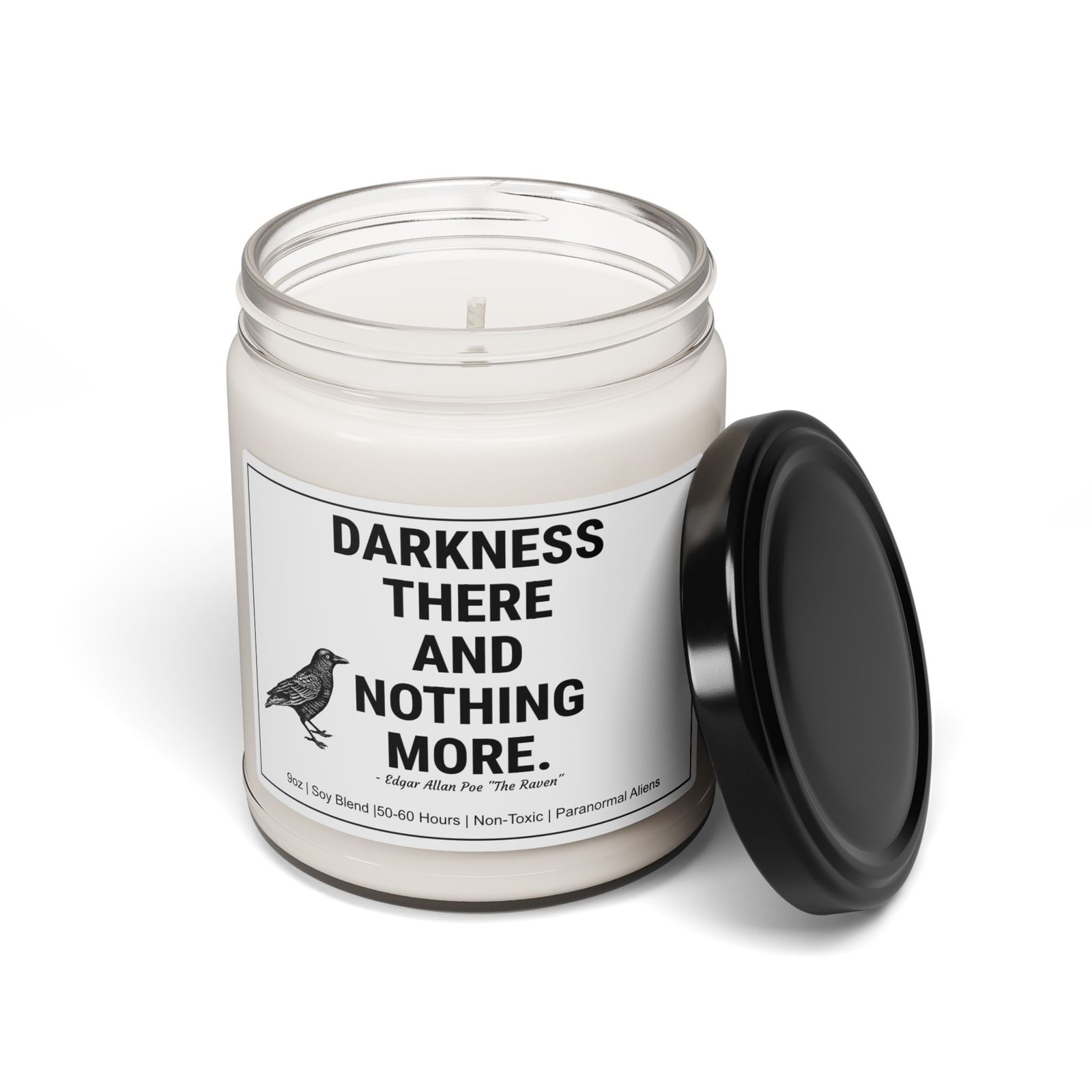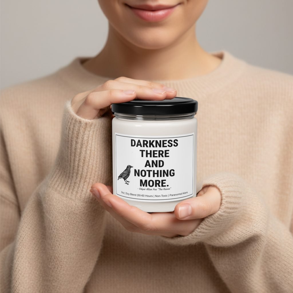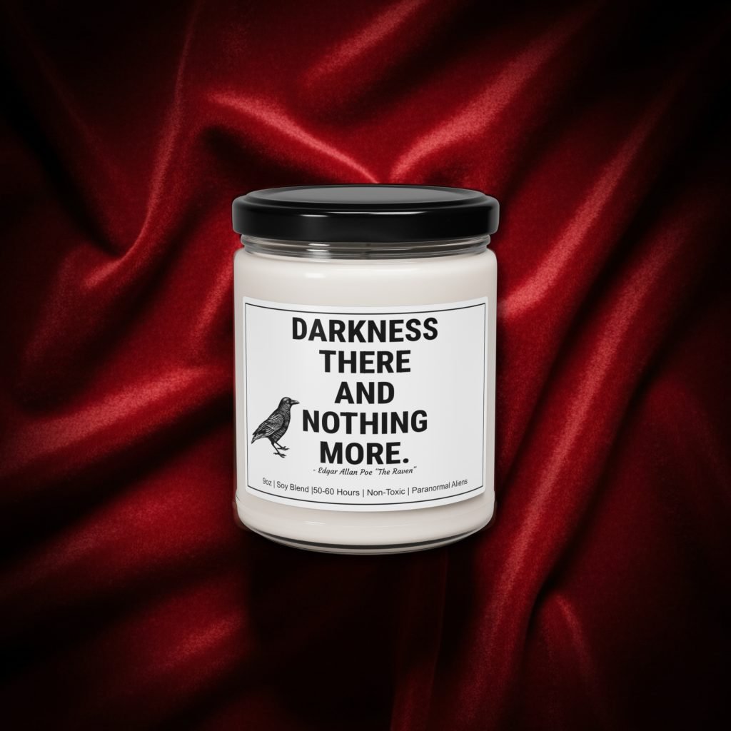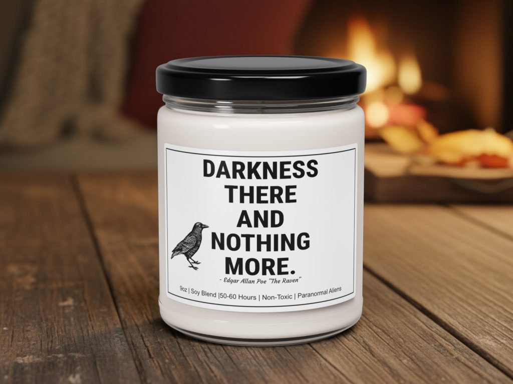 This Poe’s The Raven Candle features the chilling quote “Darkness there and nothing more.” on a reusable 9oz jar. Crafted with a soy blend and available in 10 scent options, it’s a haunting tribute to gothic literature and horror aesthetics. Ideal for Poe fans, goth decor, and gifting to those who embrace the dark and poetic.