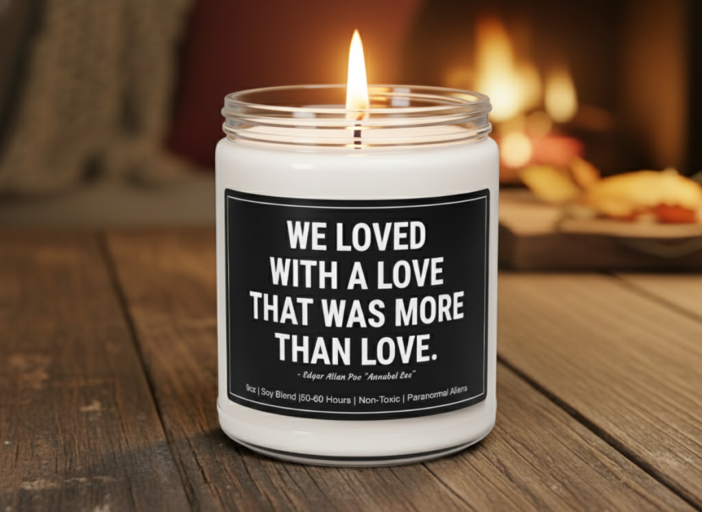 This Romantic Edgar Allan Poe Quote Candle features the line “We loved with a love that was more than love.” on a reusable 9oz jar. Made with a soy blend and available in 10 scent options, it’s a poetic tribute to gothic romance and literary passion. Ideal for Valentine’s Day, horror lovers, Poe fans, and those drawn to dark, romantic decor.