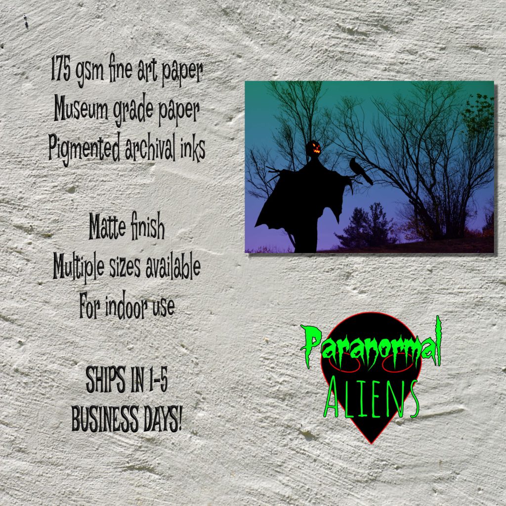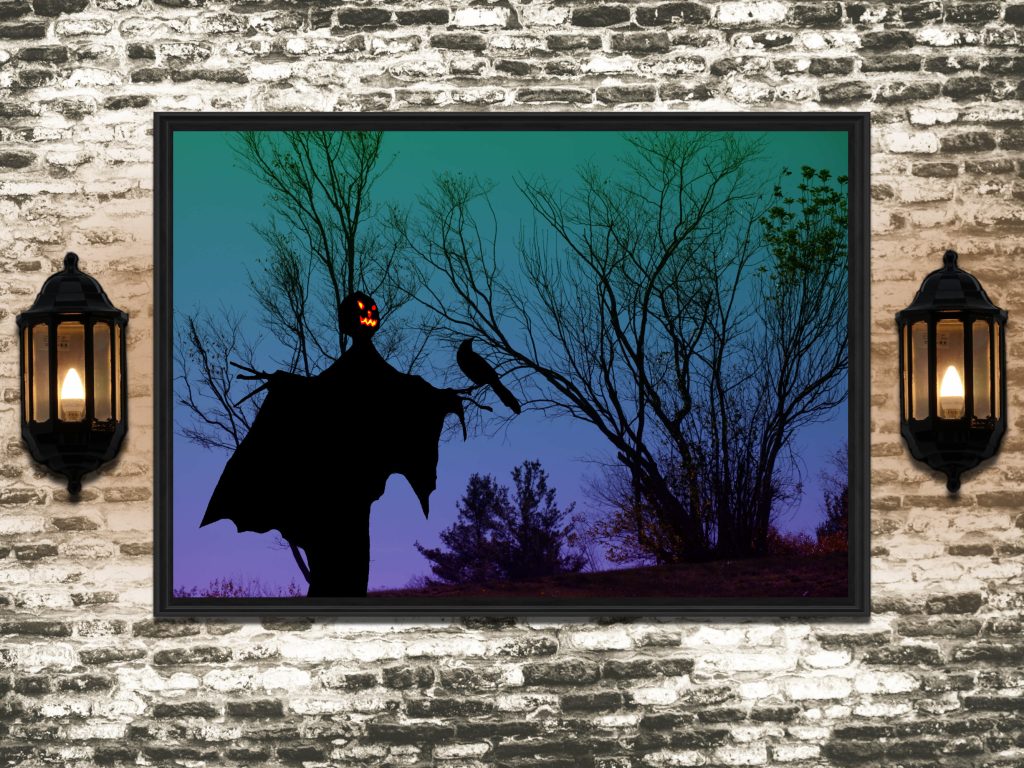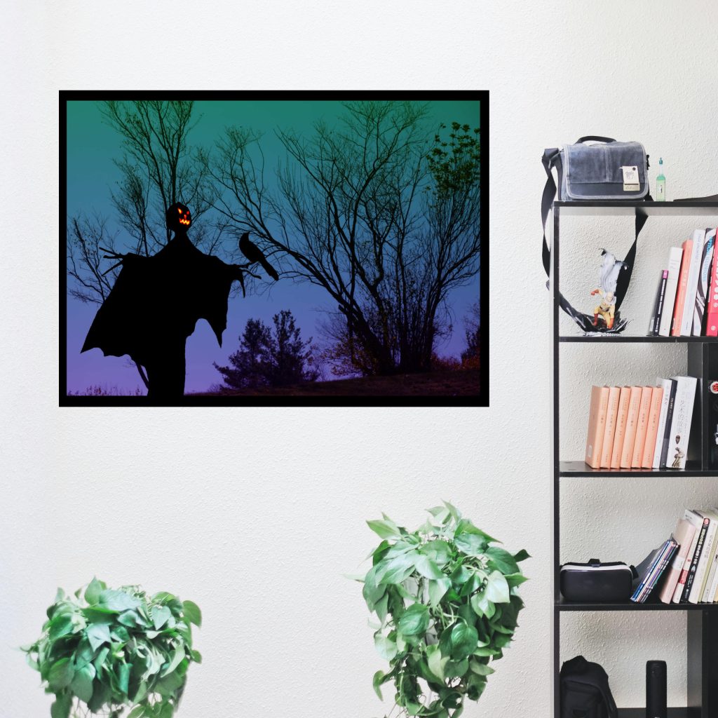This Halloween Poster Wall Art features the silhouette of a haunting jack o’ lantern scarecrow set against a moody purple and green sky at dusk. A perfect horror gift for goth girls or anyone who loves dark landscape Halloween decor and moody wall art.