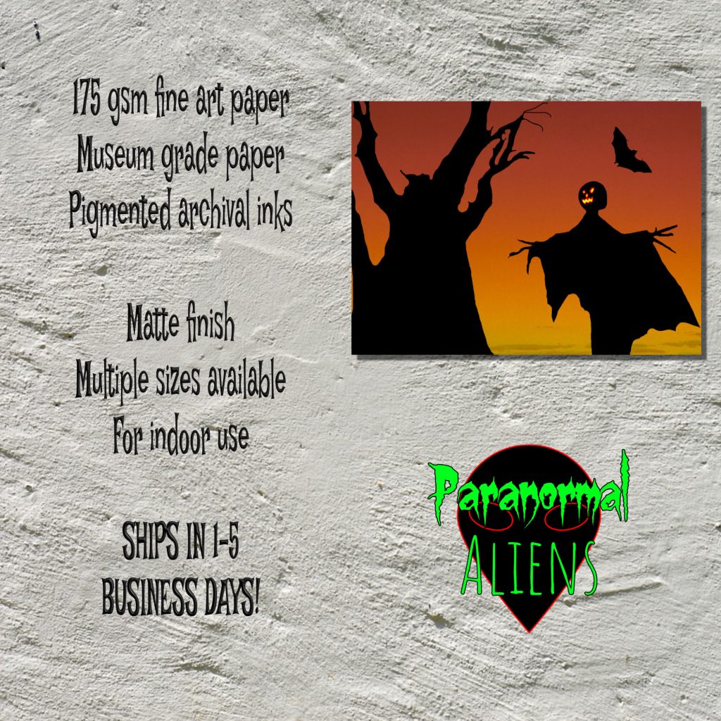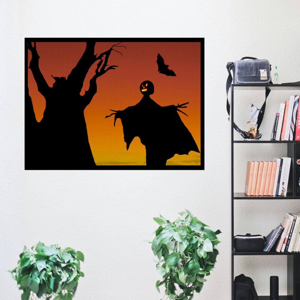 Embrace the spooky season with our captivating Sunset Halloween Wall Art. This enchanting piece features a pumpkin scarecrow jack-o-lantern, its glowing eyes casting an eerie glow, standing proudly next to a hauntingly beautiful dead tree. As the sun sets, painting the sky in shades of orange, a lone bat gracefully flies across the horizon, adding an extra touch of mystery to the scene. This Sunset Poster perfectly captures the essence of Halloween, making it an ideal addition to your goth wall art collection. It’s not just a decorative piece, but also a horror gift for men who appreciate the allure of horror. Additionally, it’s a great choice as a creepy art print and a goth girl gift that will leave a lasting impression. Let this Sunset Halloween Wall Art piece transport you to a world where Halloween reigns supreme, and the atmosphere is filled with an enchanting sense of macabre beauty.