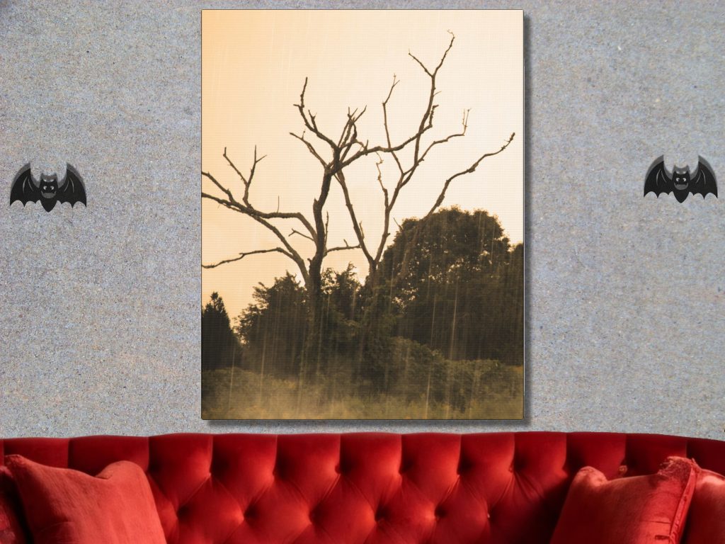 This Dead Tree Canvas Wall Art captures a haunting creepy landscape of a barren tree against a stormy, rain-soaked sepia backdrop. Perfect as goth decor or a unique gift for her, this tree art canvas print brings moody, dramatic vibes to any space.