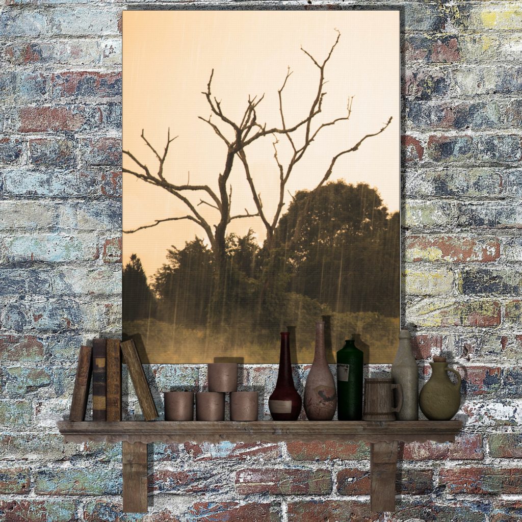 This Dead Tree Canvas Wall Art captures a haunting creepy landscape of a barren tree against a stormy, rain-soaked sepia backdrop.