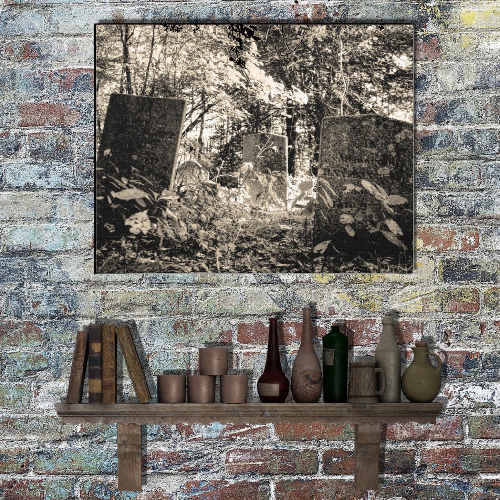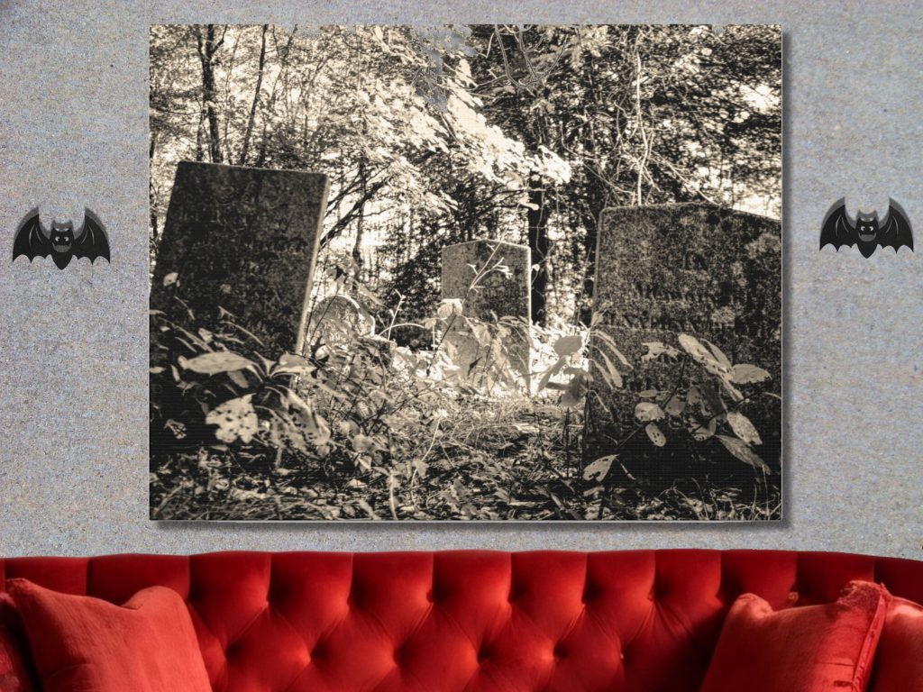 This sepia Gothic Cemetery Canvas Wall Print features two large forgotten about tombstones lost in a haunted forest, creating an eerie and atmospheric dark landscape. Perfect for horror decor, or as a goth gift for women or gift for men, this Cemetery Canvas Wall Print adds a chilling and dramatic vibe to any space.