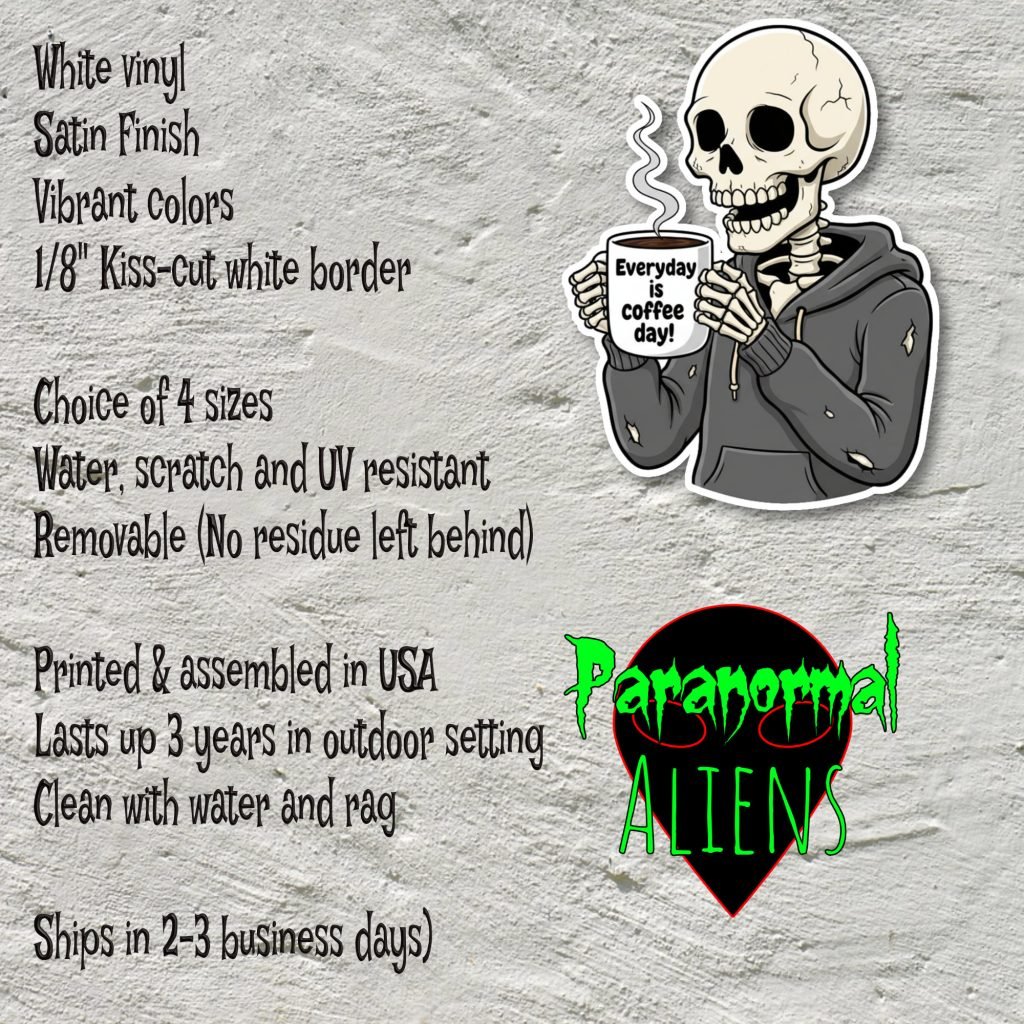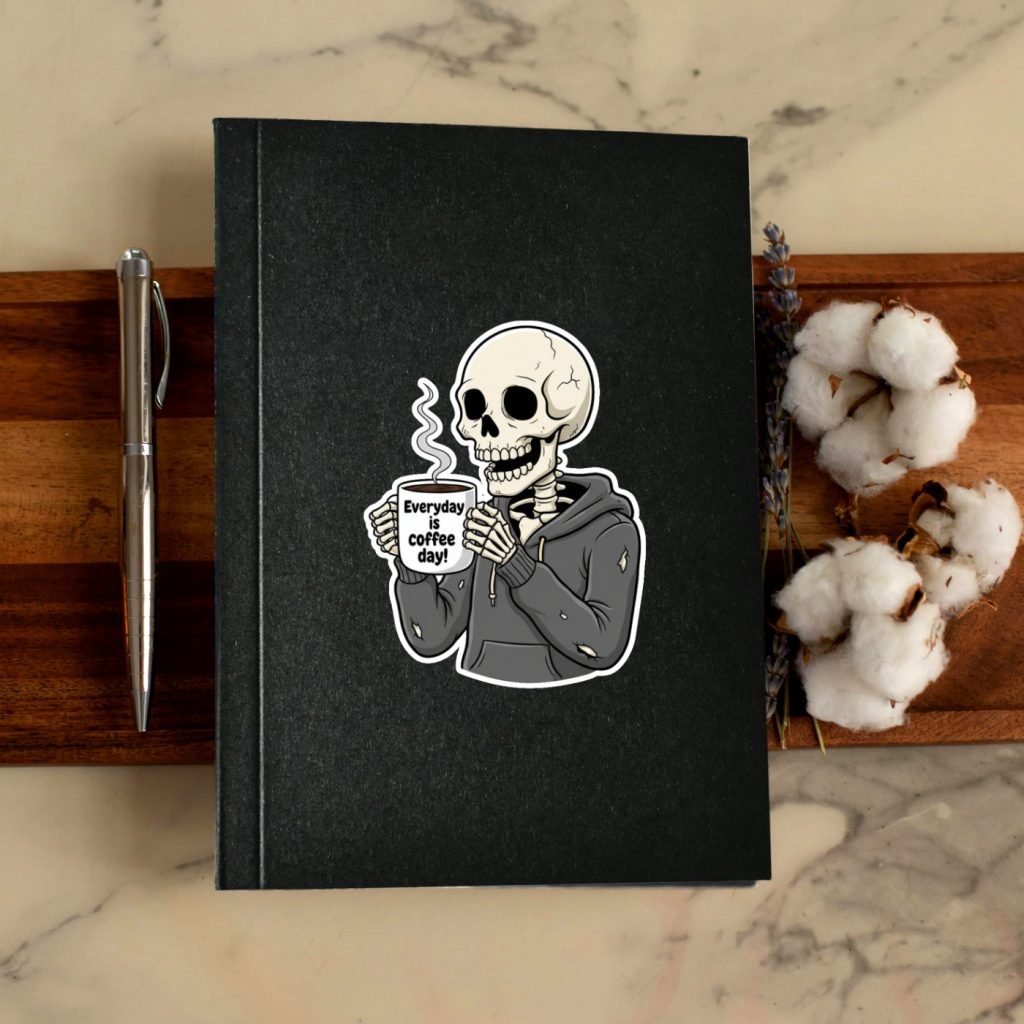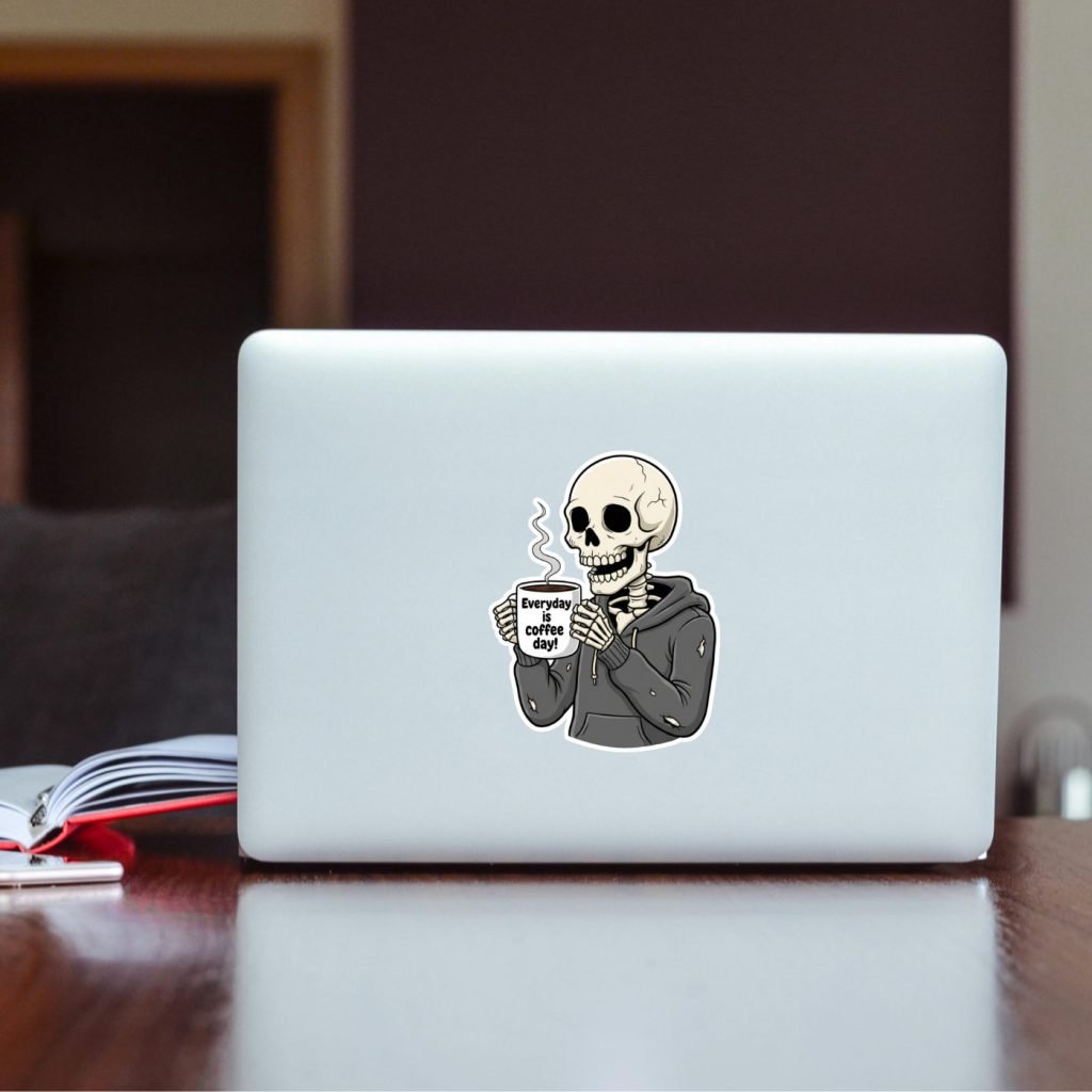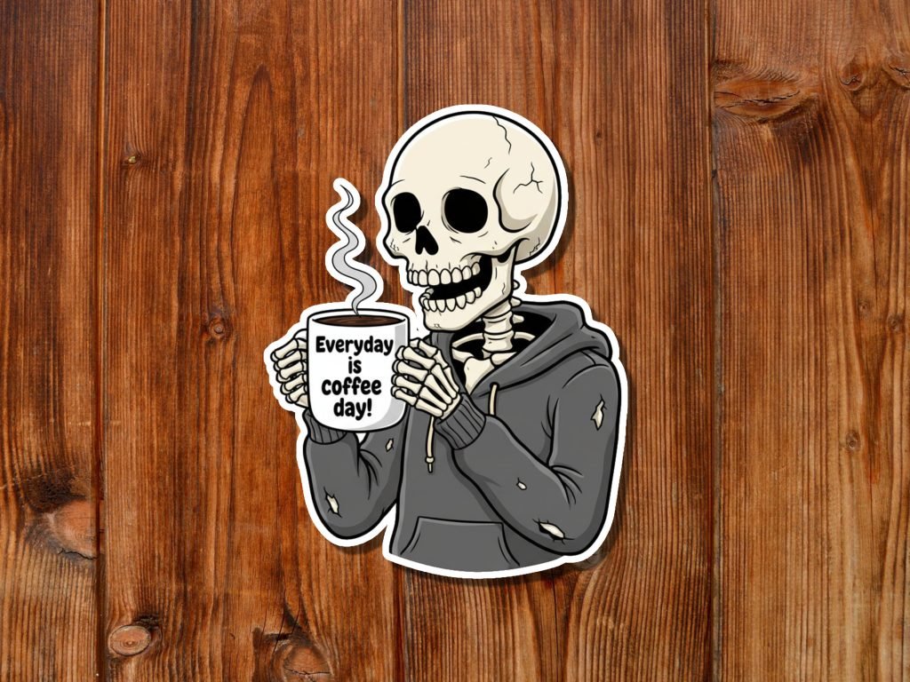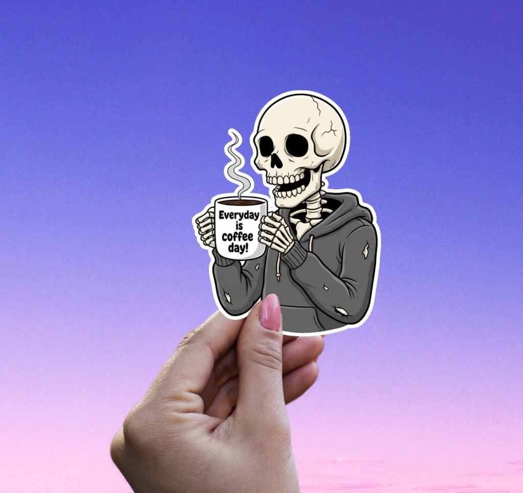 This Skeleton Coffee Sticker Decal features vibrant colors, satin finish, and kiss-cut edges with white borders. Waterproof and bold, it’s a spooky vinyl gift for coffee and horror lovers.