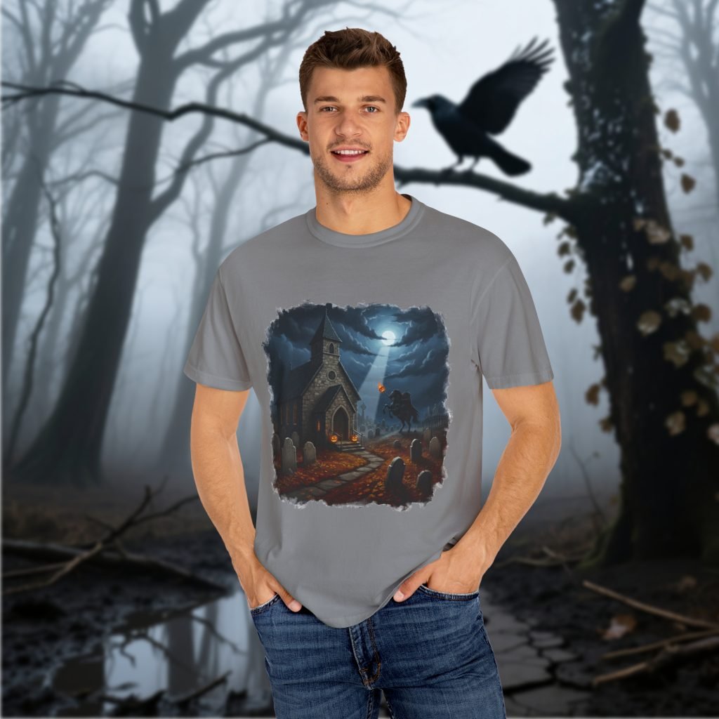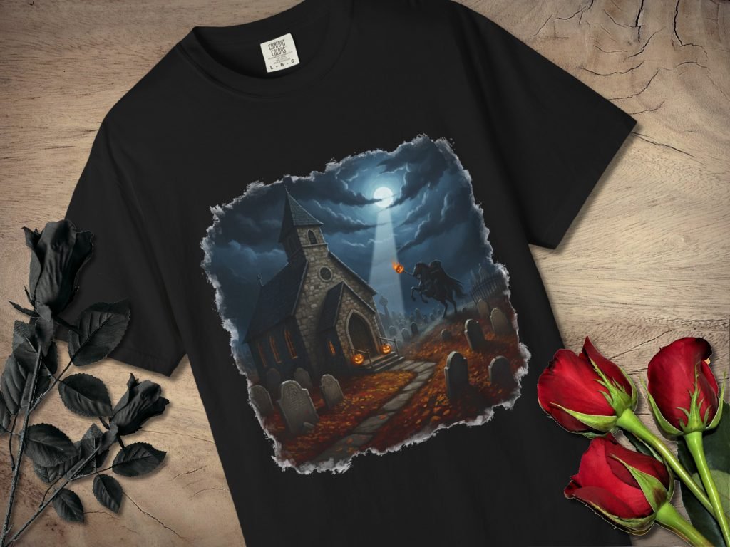 This Sleepy Hollow Halloween Shirt features Sleepy Hollow text and cemetery art on a comfort color tee. Made with pre-shrunk ring-spun US cotton and a relaxed fit for horror fans and spooky season gifting.