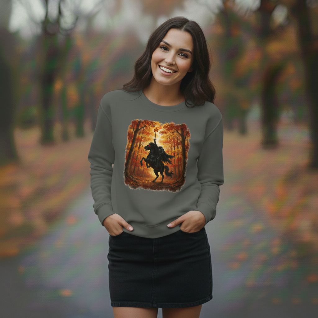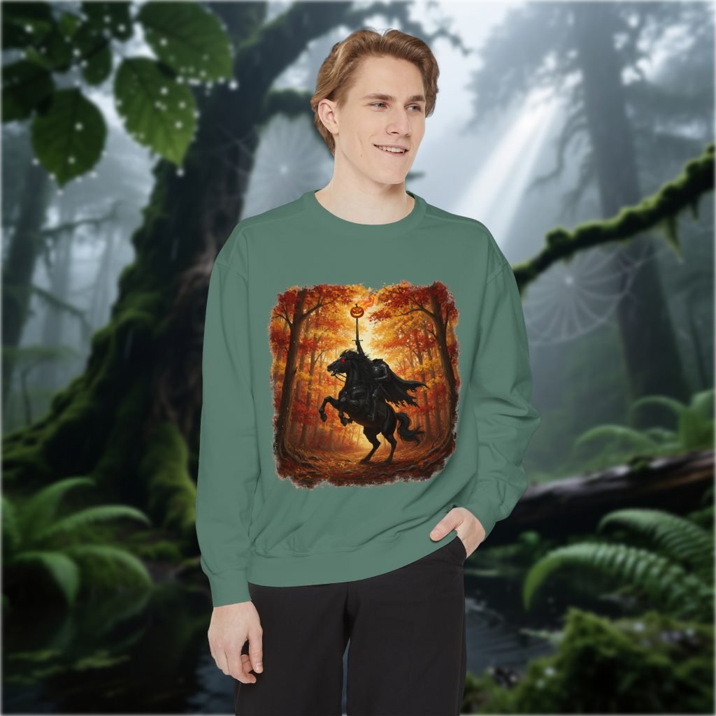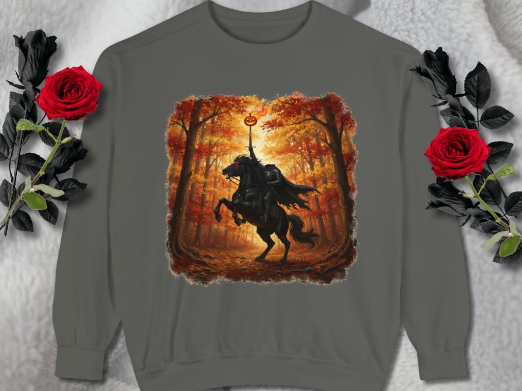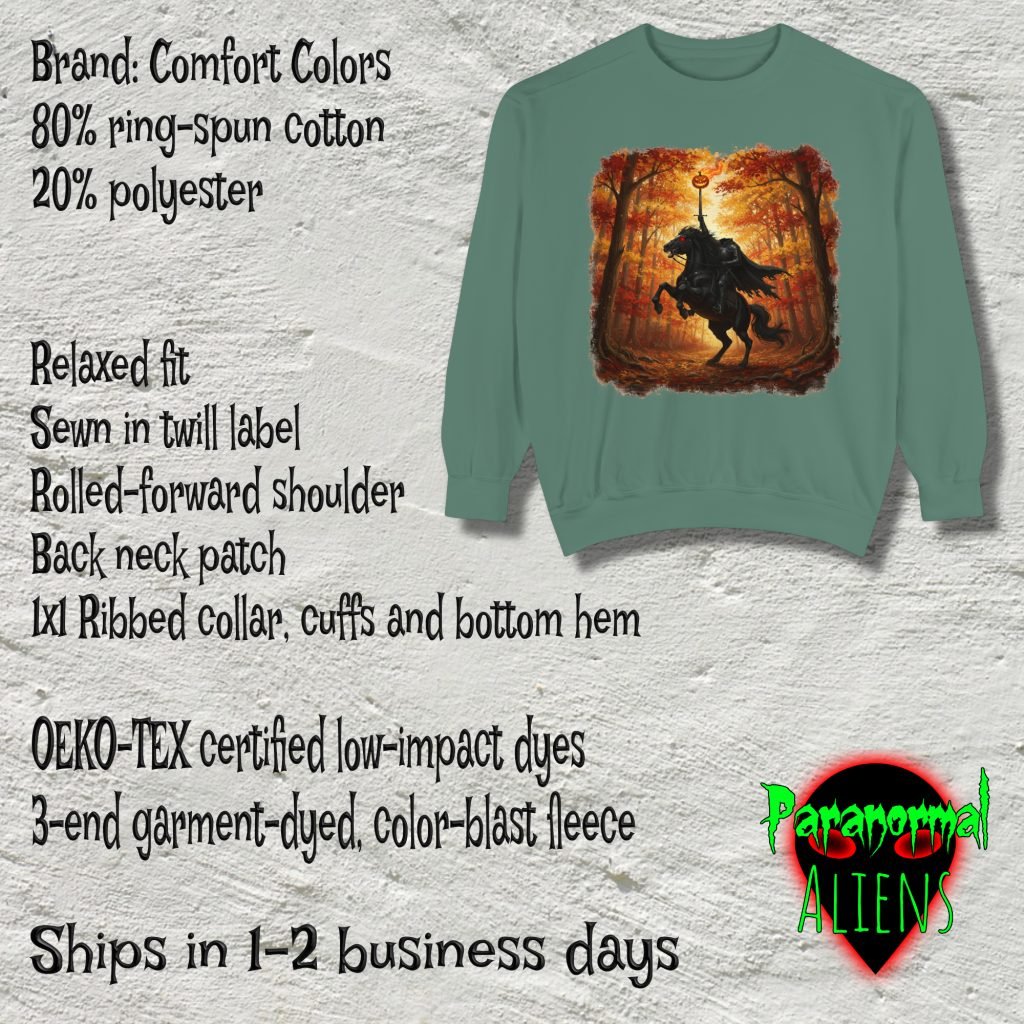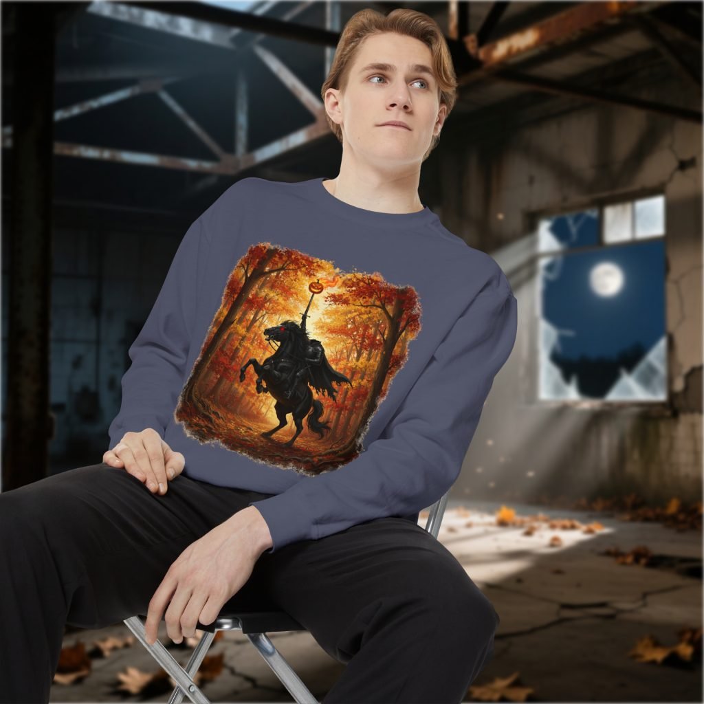 This Sleepy Hollow New York Sweatshirt features the Headless Horseman in Sleepy Hollow New York. Made with comfort colors brand, cotton-poly blend, and relaxed fit for horror and gothic style lovers.