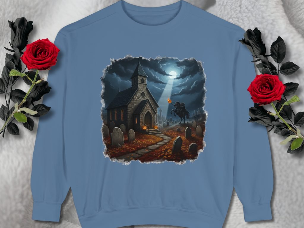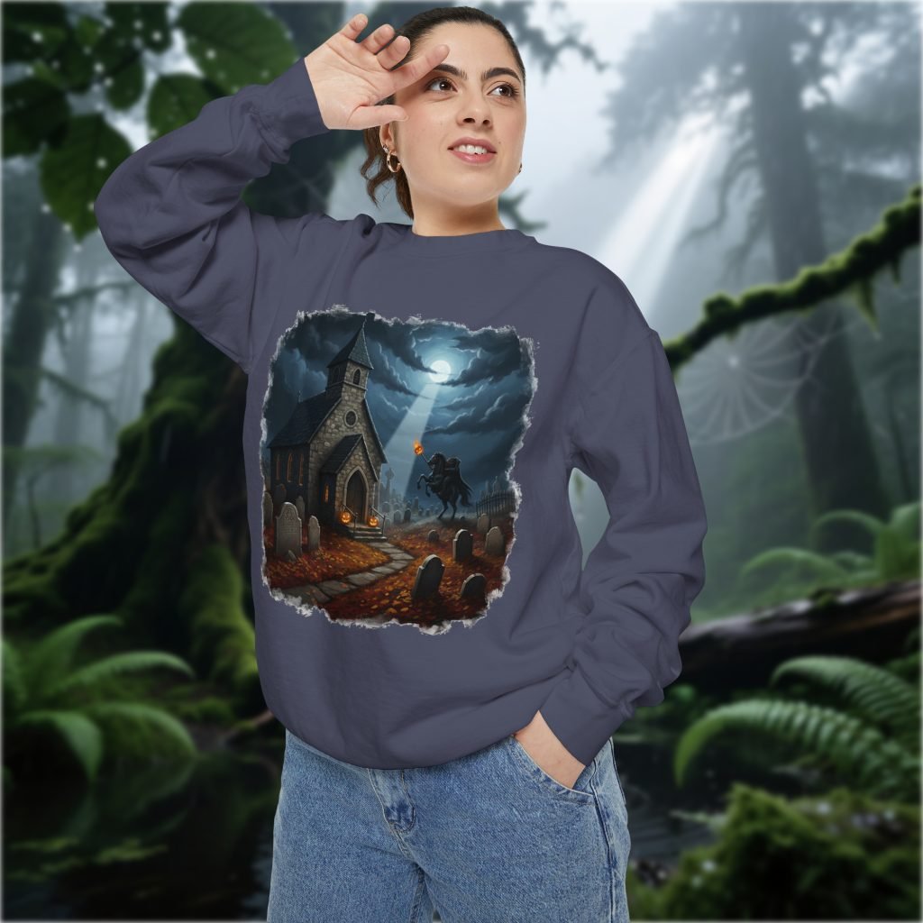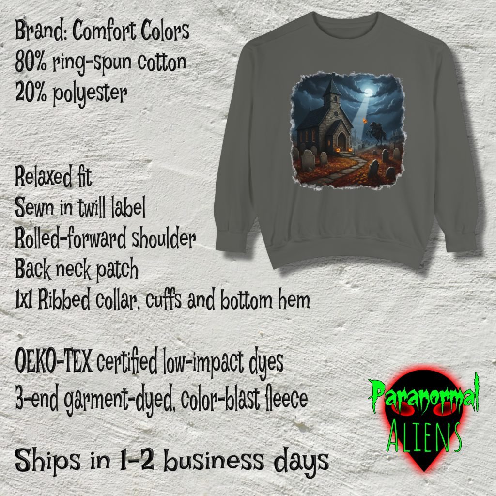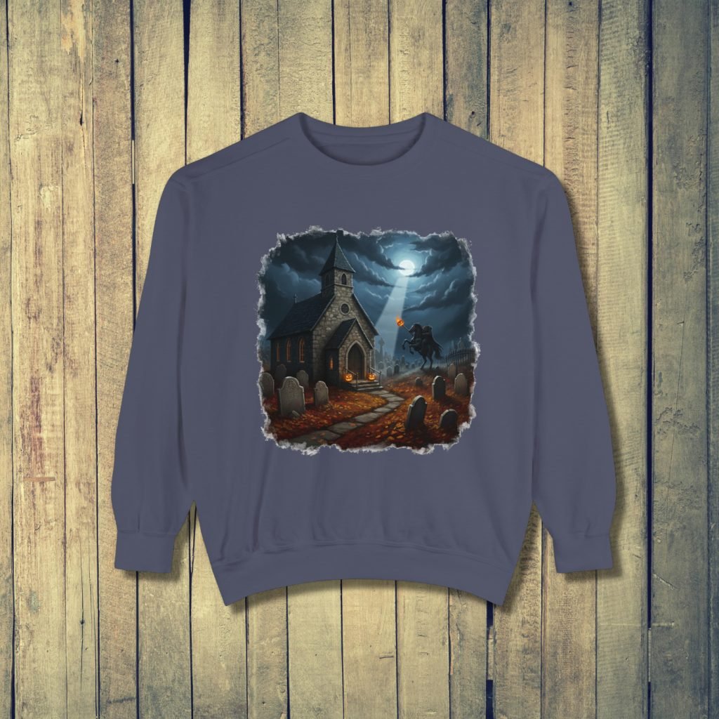 This Sleepy Hollow Sweatshirt features Sleepy Hollow Cemetery art on comfort colors brand. Soft cotton-poly blend and relaxed fit make it ideal for horror fans and gothic Halloween gifting.