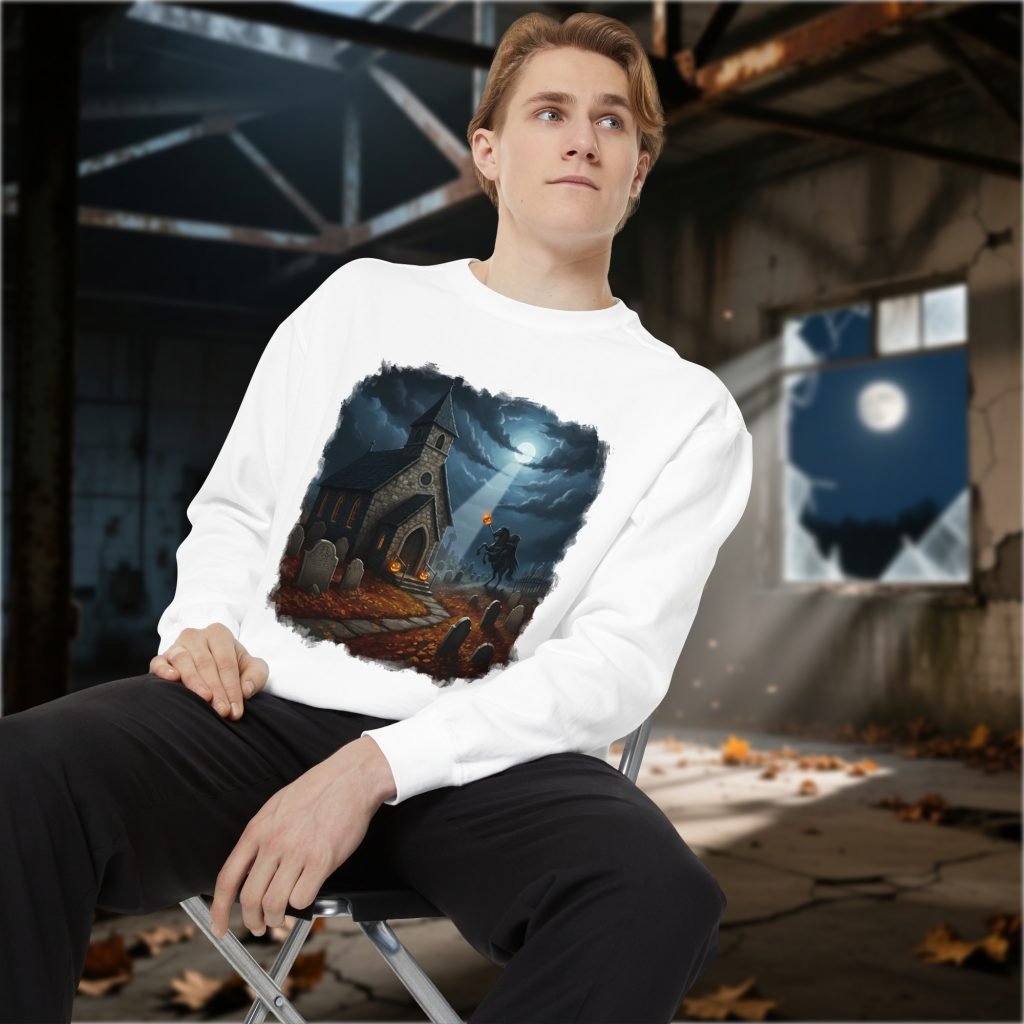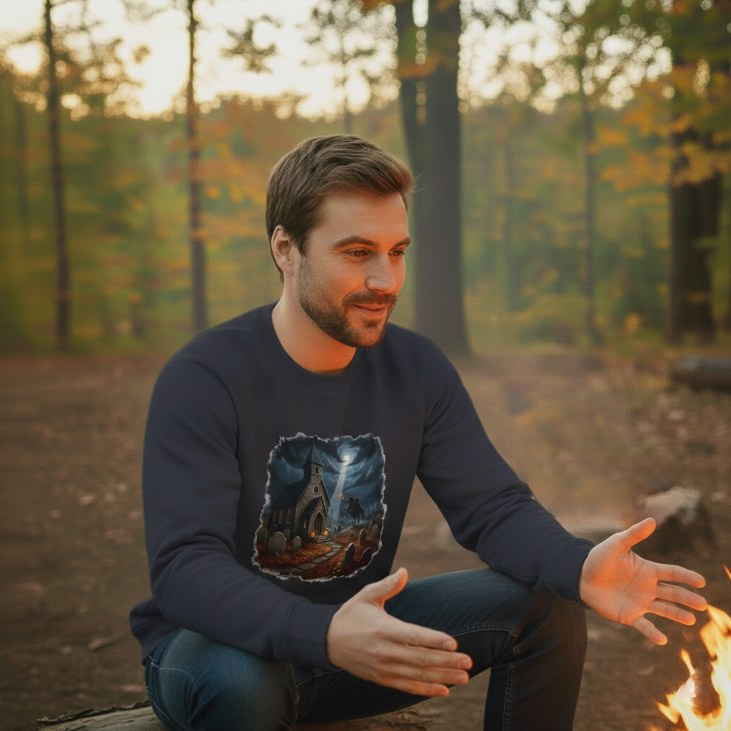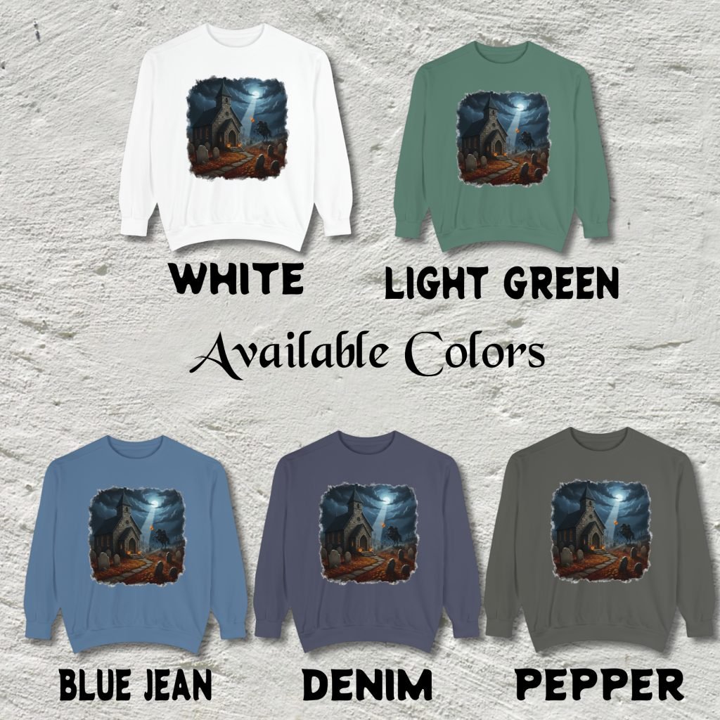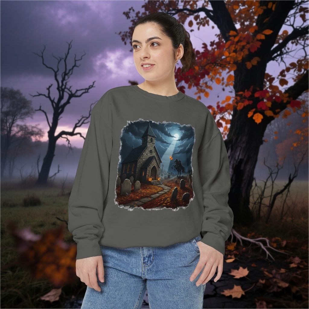 This Sleepy Hollow Sweatshirt features Sleepy Hollow Cemetery art on comfort colors brand. Soft cotton-poly blend and relaxed fit make it ideal for horror fans and gothic Halloween gifting.