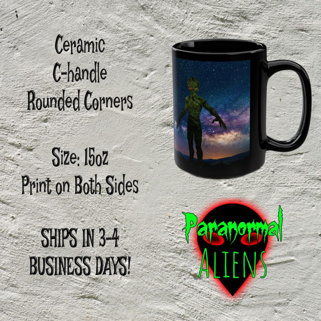 Elevate your coffee experience with our stunning UFO Alien Mug, a captivating blend of beauty and spookiness. This goth coffee cup features an otherworldly scene that will send chills down your spine. A UFO ship breaks through the atmosphere in a mesmerizing cloud of mist, while a creepy alien with red eyes stands in a haunting field. With its unique design inspired by Area 51 space aliens, this black alien mug is a perfect choice for a horror gift for men or a gift for women who appreciate the mysterious and macabre. The combination of beauty and spookiness makes it a standout piece for gothic decor, and its functionality as a coffee mug adds to its appeal. Indulge in your favorite brews with a touch of darkness using our UFO Alien Mug—a spooky yet gorgeous statement piece that adds a hint of intrigue to your daily routine.