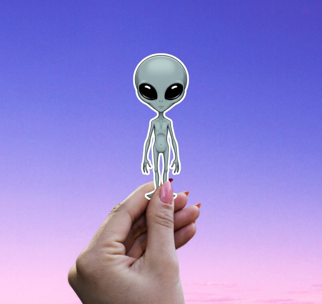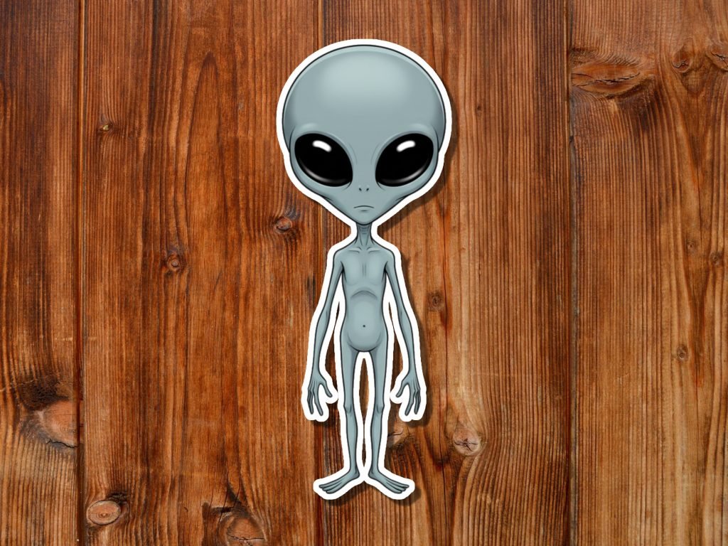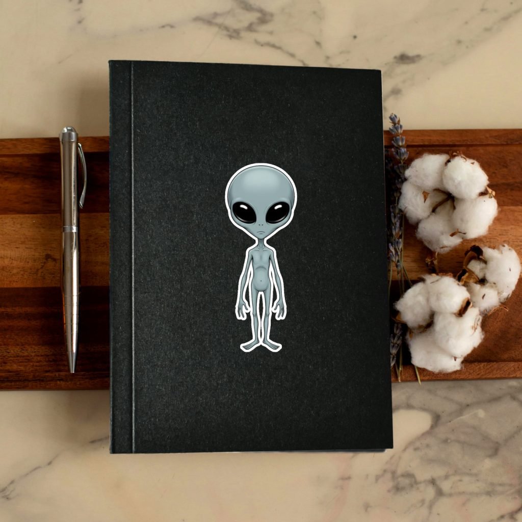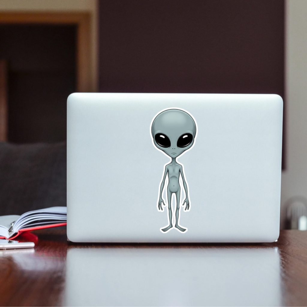 This Space Alien Sticker features a gray extraterrestrial design with vibrant colors, satin finish, and kiss-cut edges. Waterproof and ideal for horror fans and Halloween tech decor.