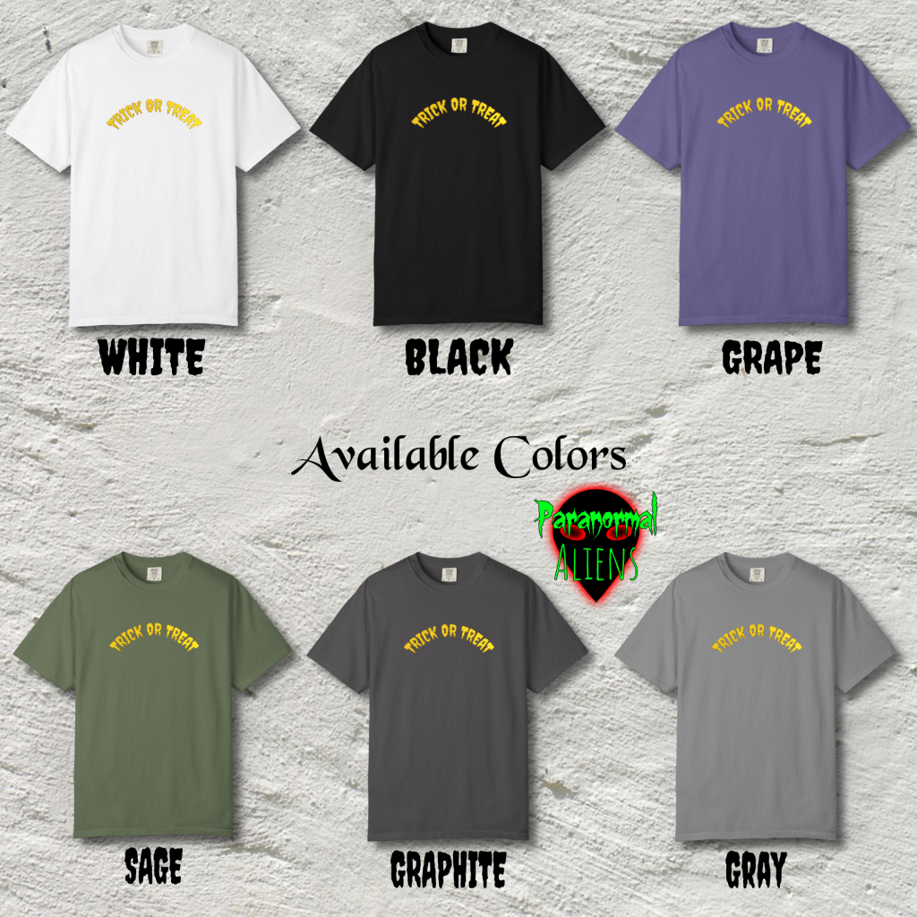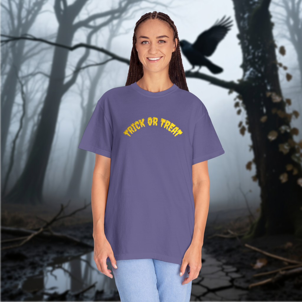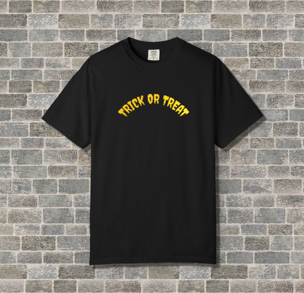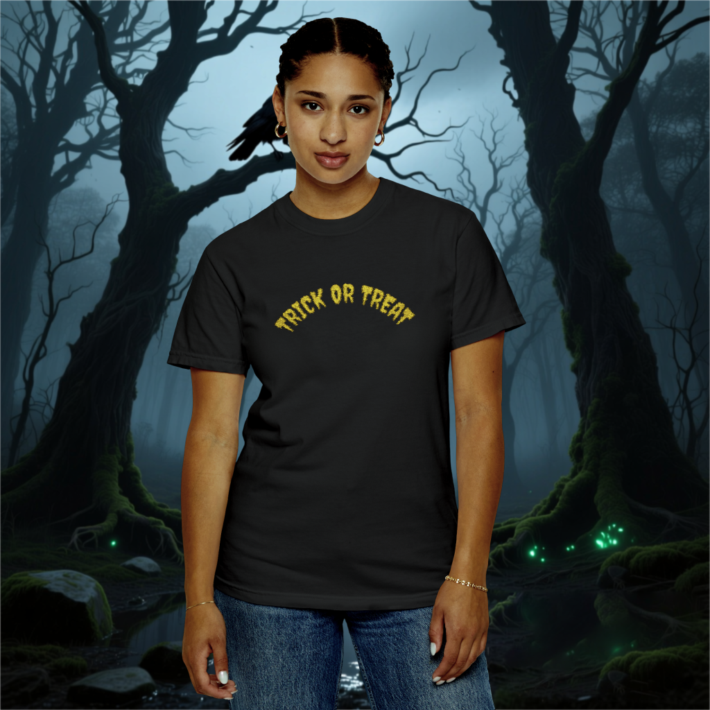 This embroidered Halloween shirt features stitched Trick or Treat text on comfort colors brand. Made with pre-shrunk ring-spun US cotton and a relaxed fit for spooky season gifting and horror fans.