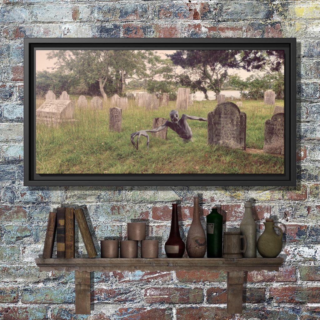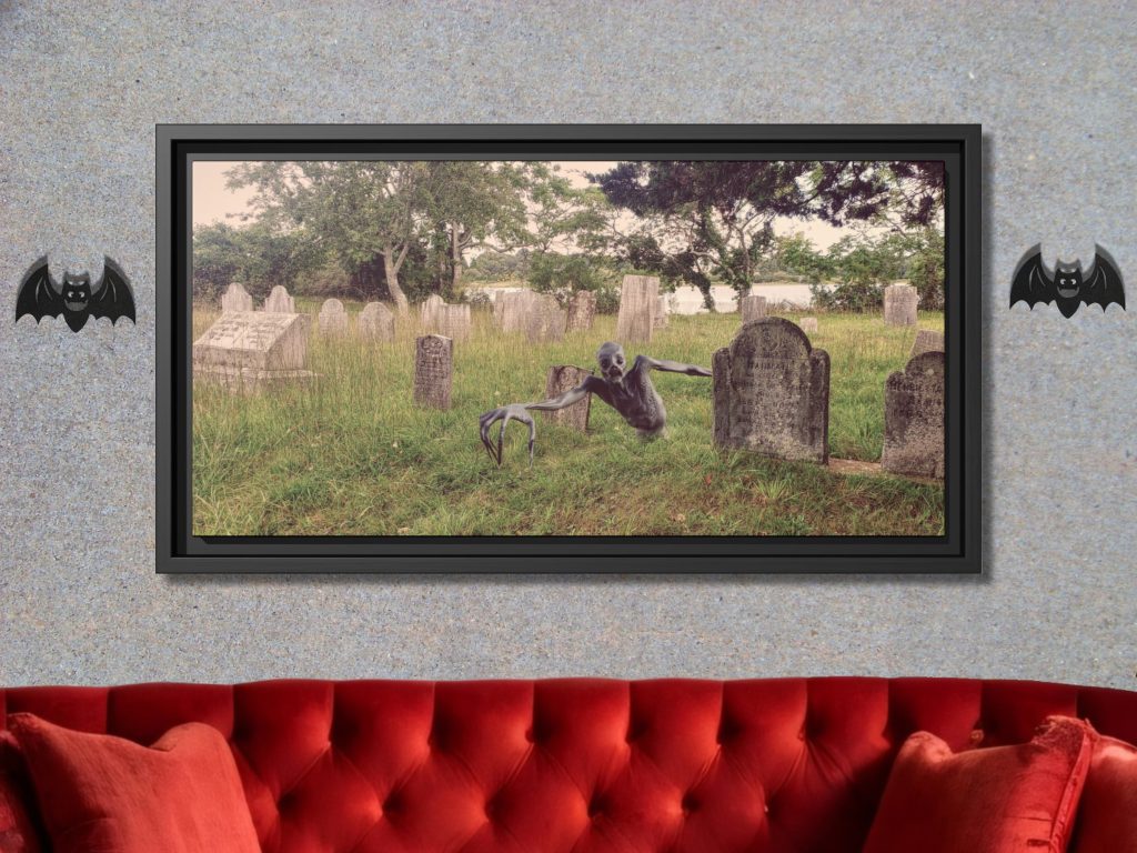 Cemetery Framed Canvas Wall Print features a eerie zombie emerging from its grave in a New England cemetery that captures the chilling essence of a gloomy fall day. Perfect for a dad gift, this graveyard Cemetery Framed Canvas Wall Print adds a spooky touch to any space with its blend of horror goth decor and fall landscape.